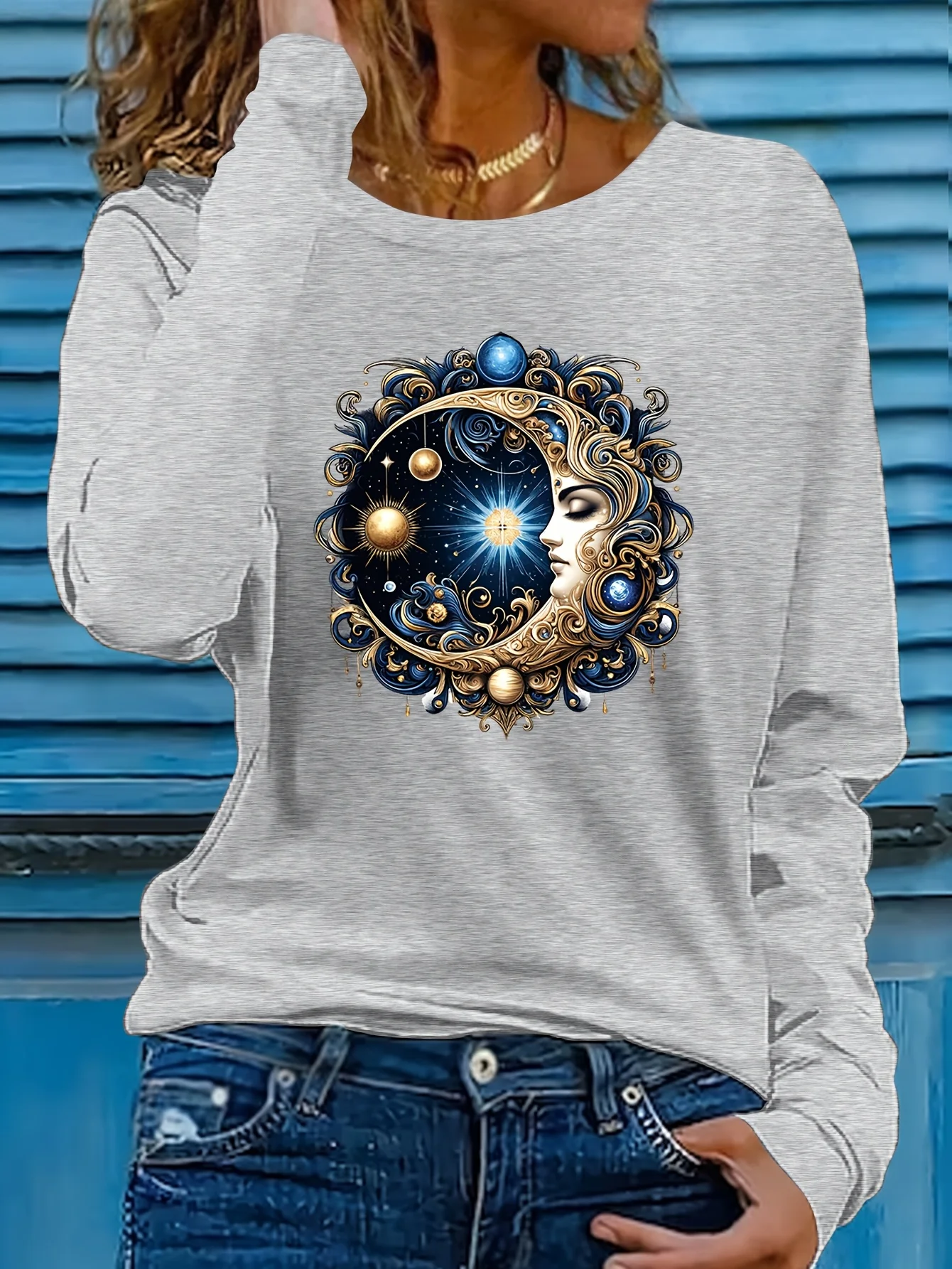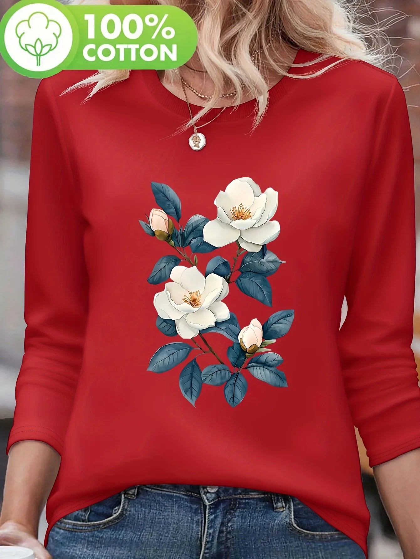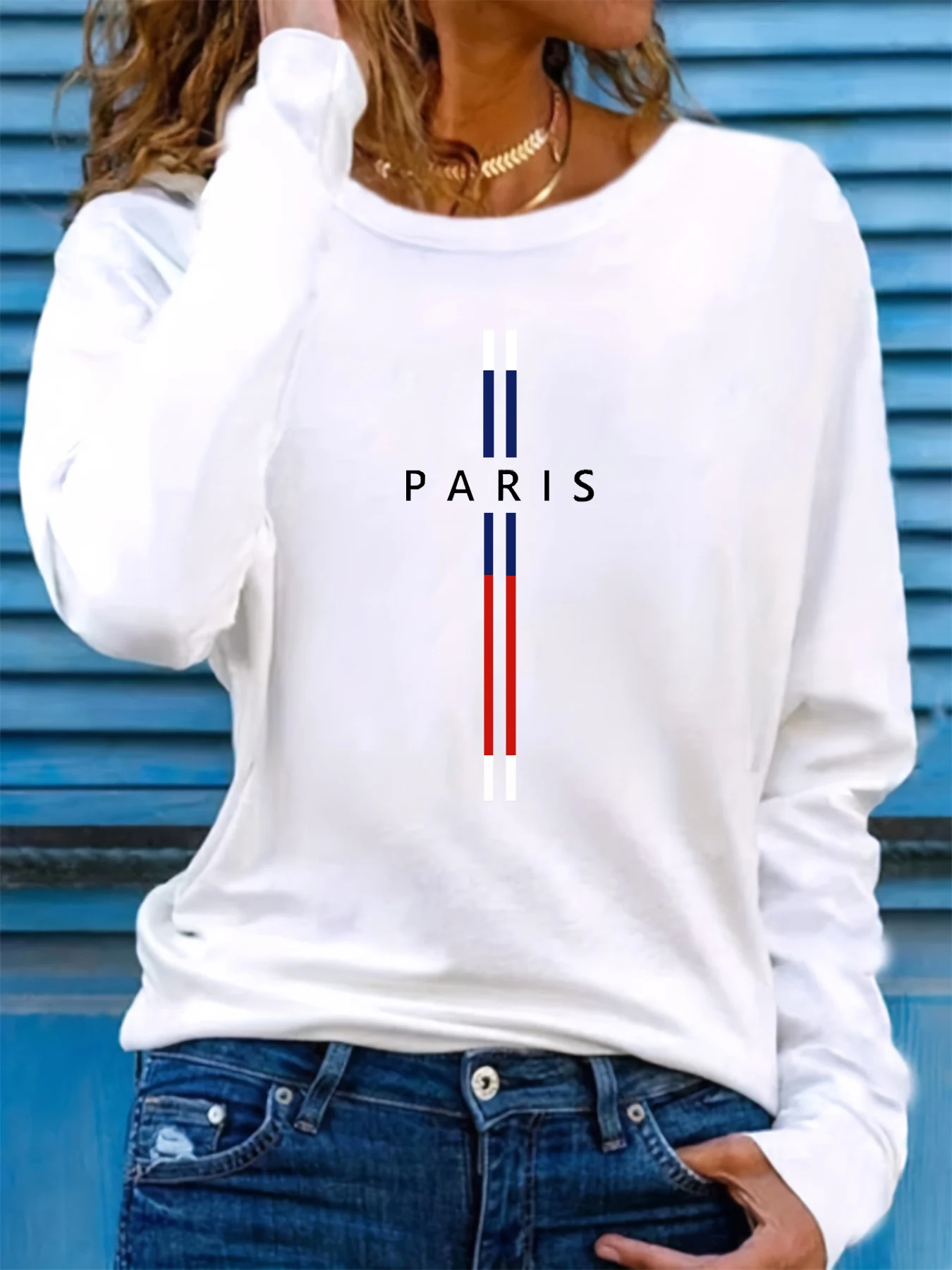 100% pure cotton women's spring and autumn comfortable casual long sleeved Paris graphic printed round neck T-shirt