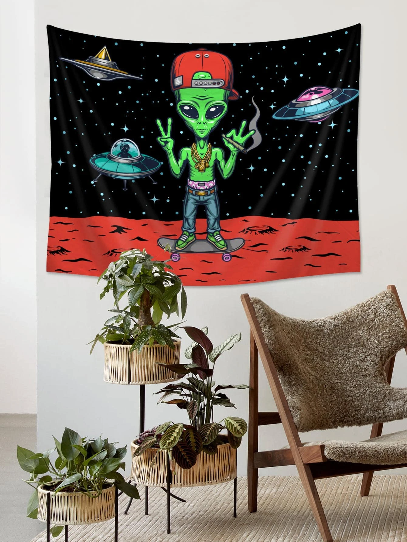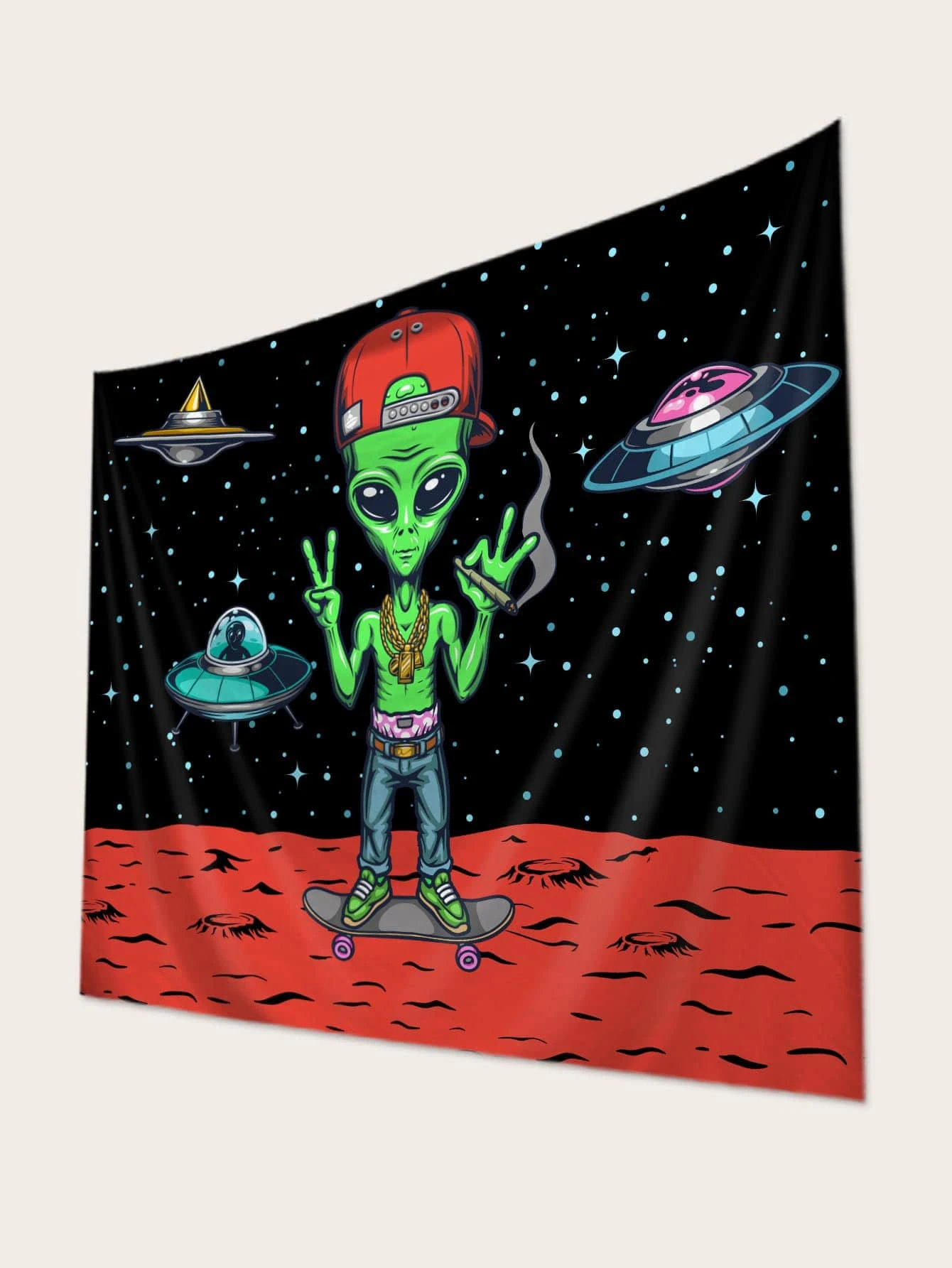 1pc Alien Pattern Tapestry, Cartoon Planet & Spaceship Print Hanging Blanket For Home Decoration, Flag For Room, Room Decor