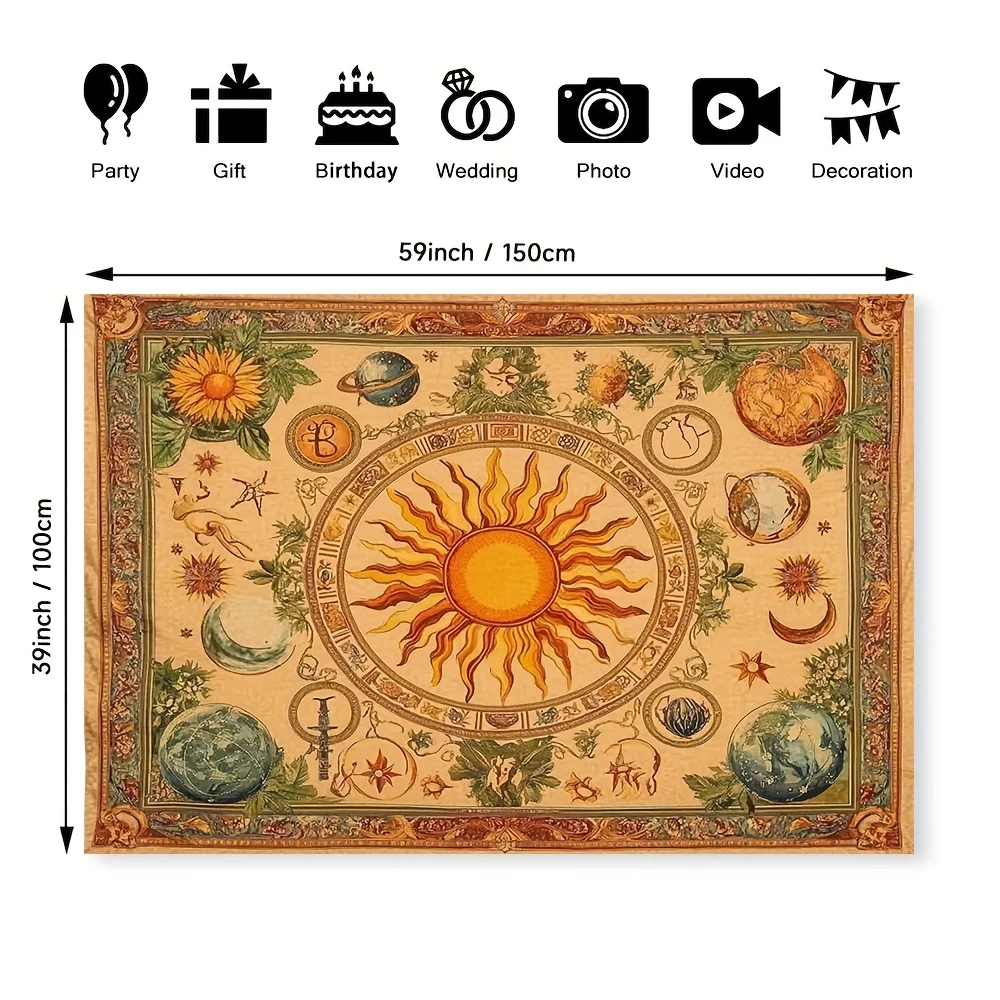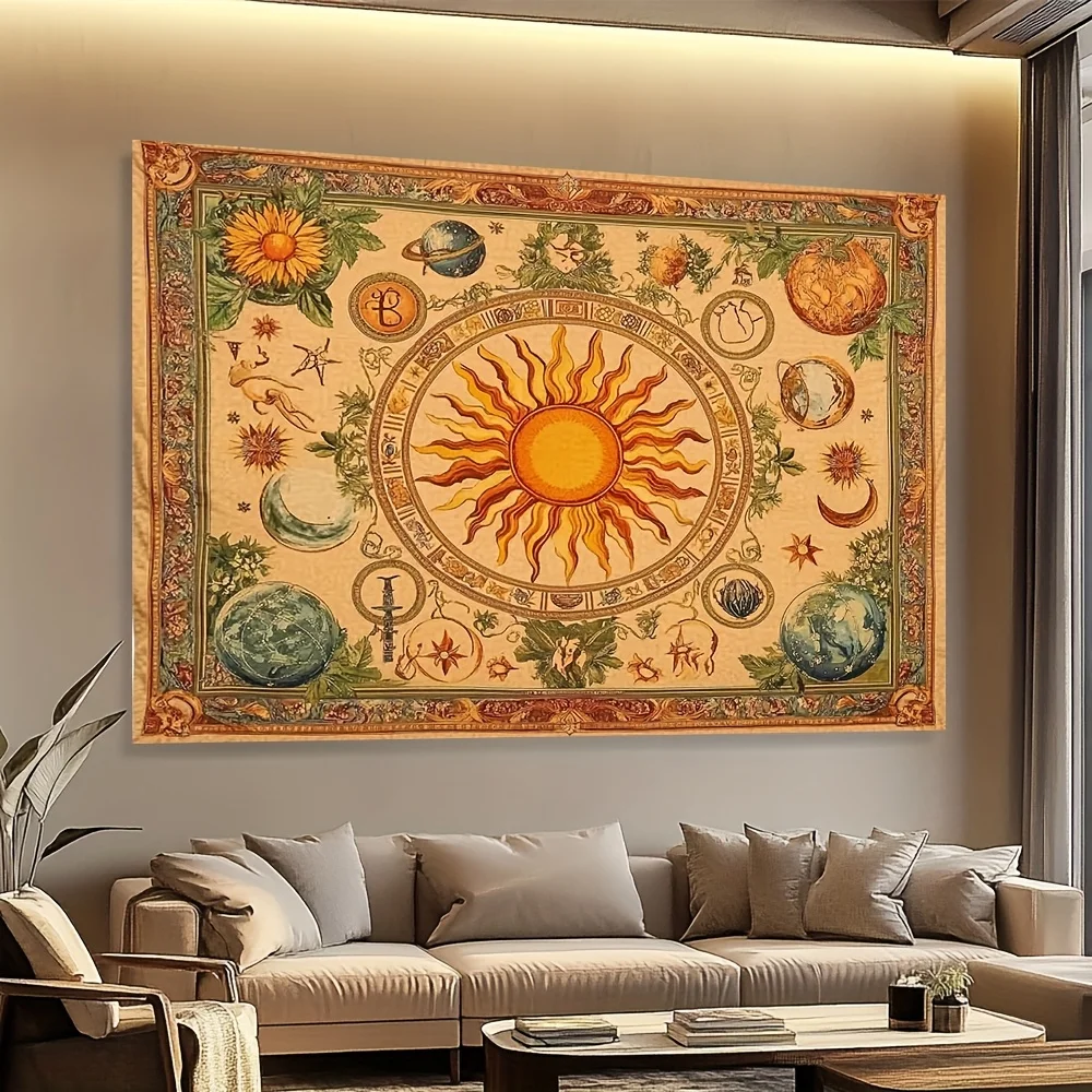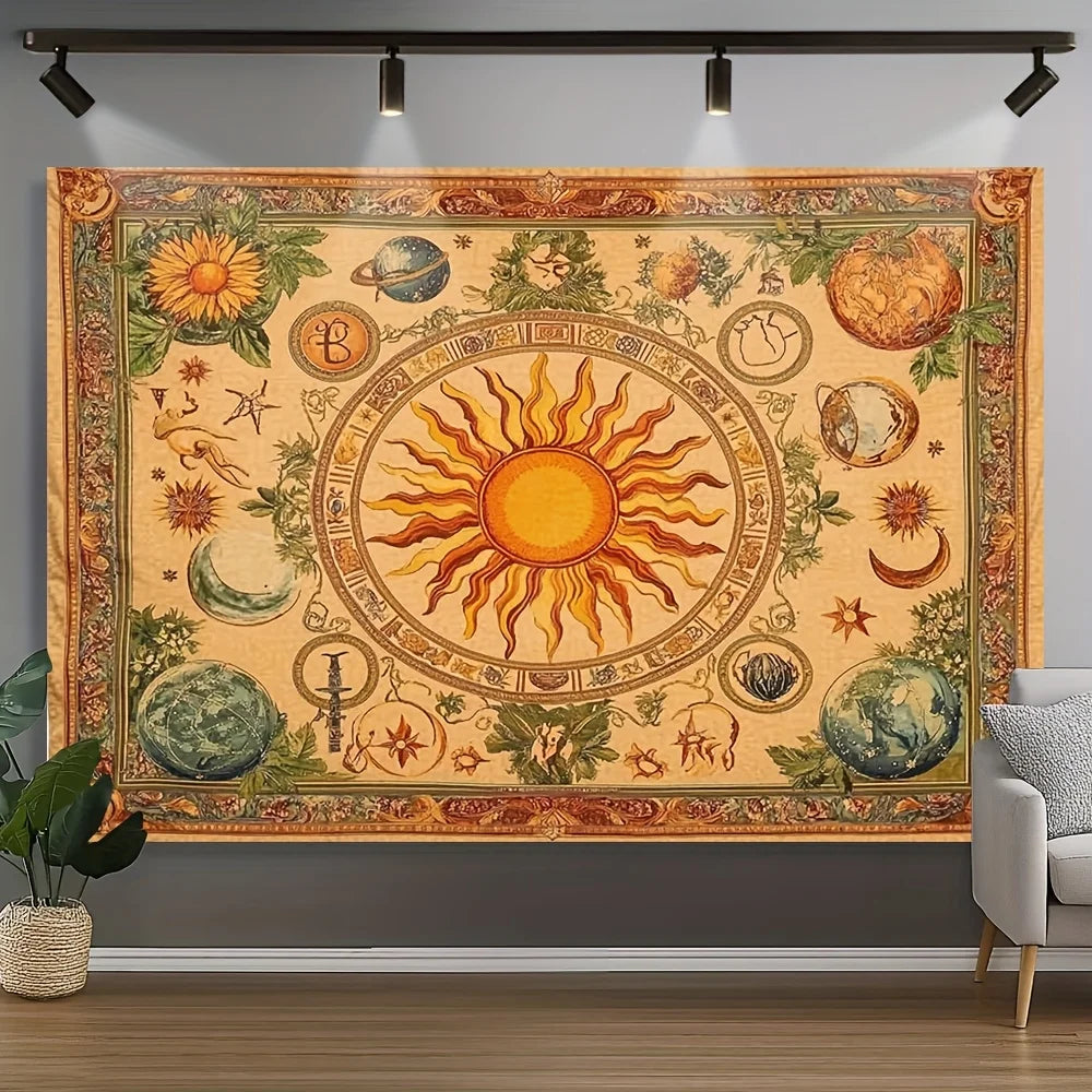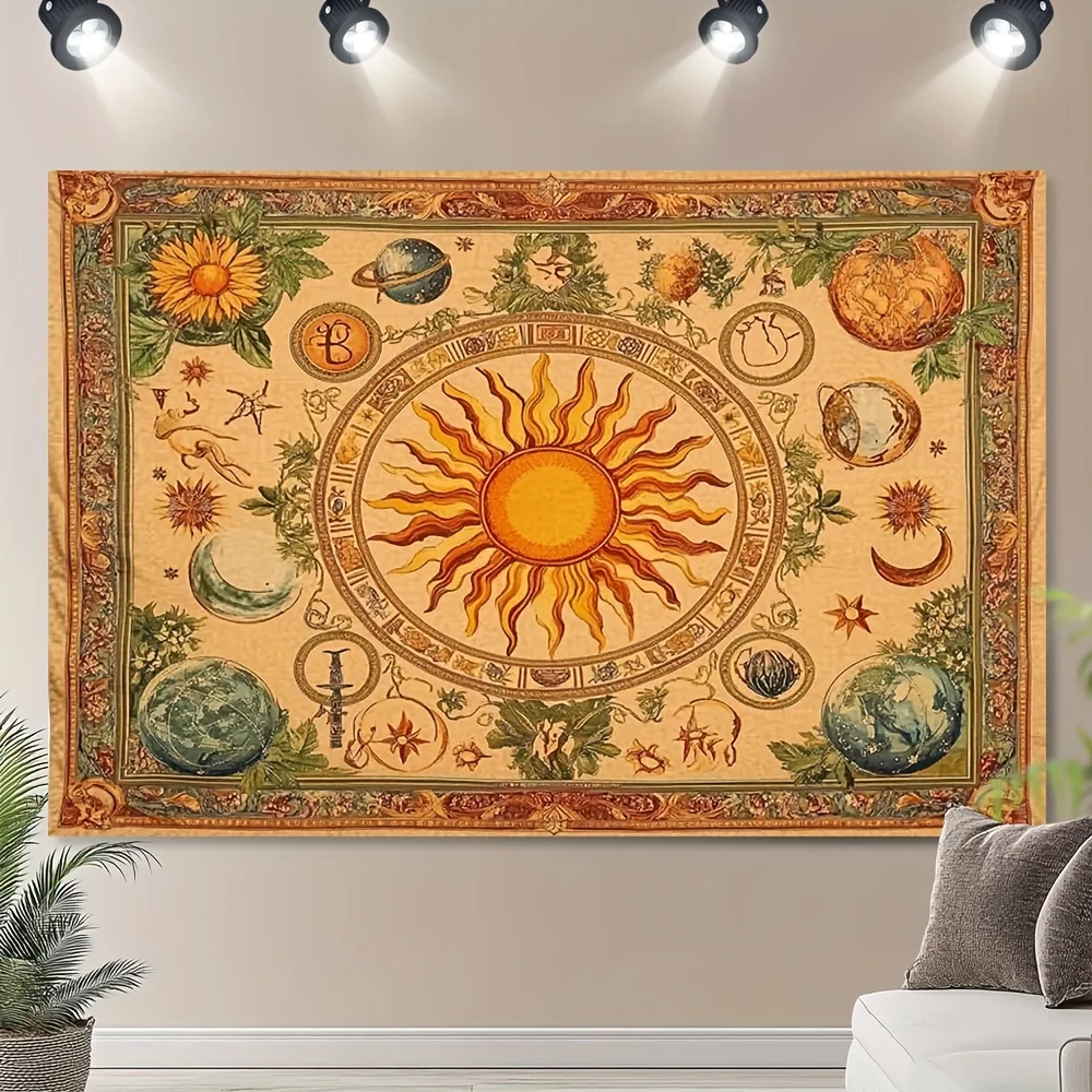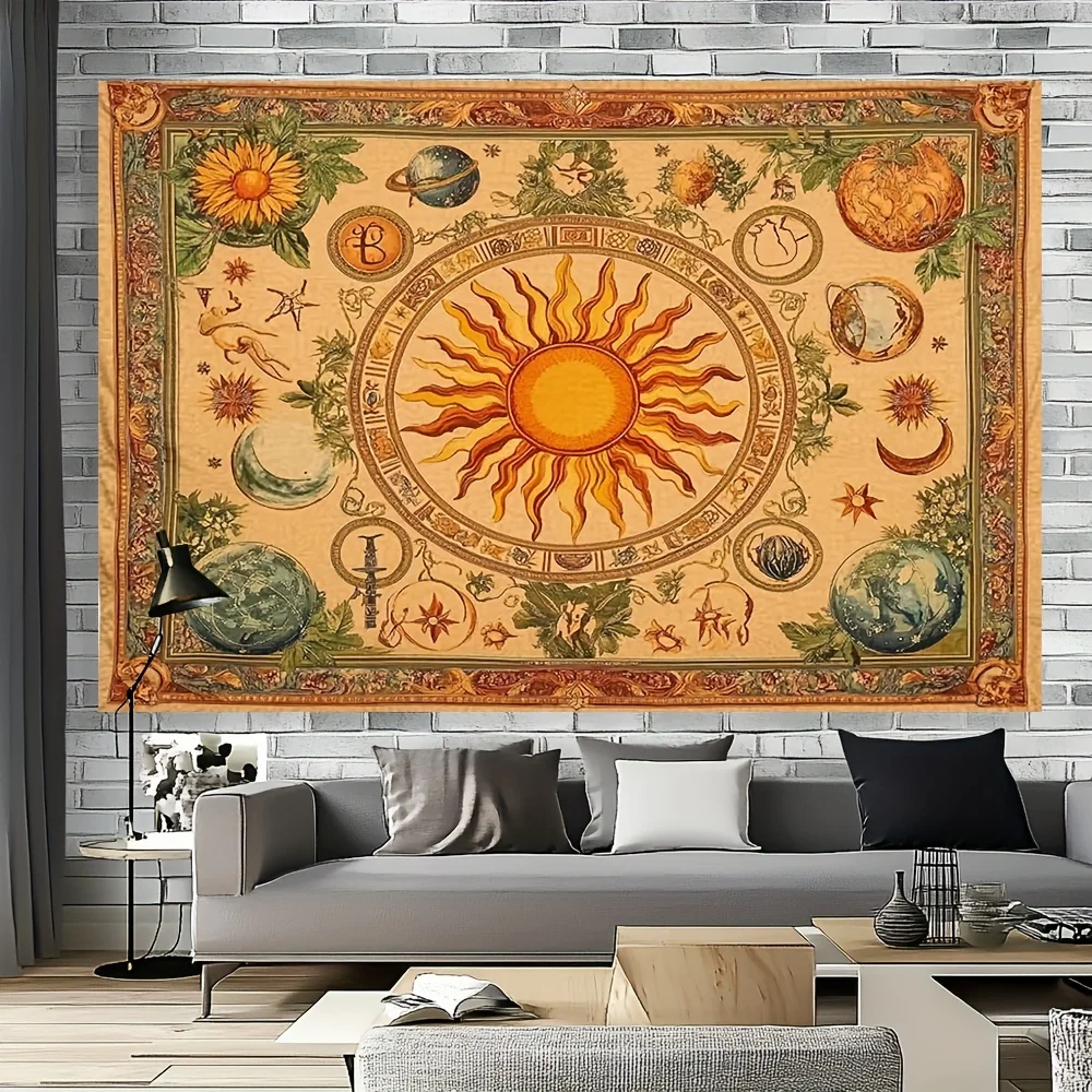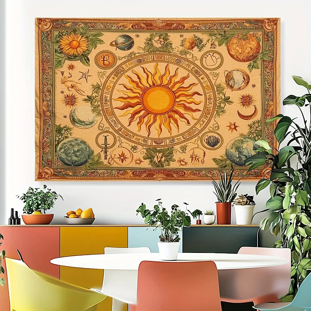 1pc Bohemian celestial tapestry with sun, moon, sunflower and butterfly pattern - Vibrant yellow polyester wall hanging