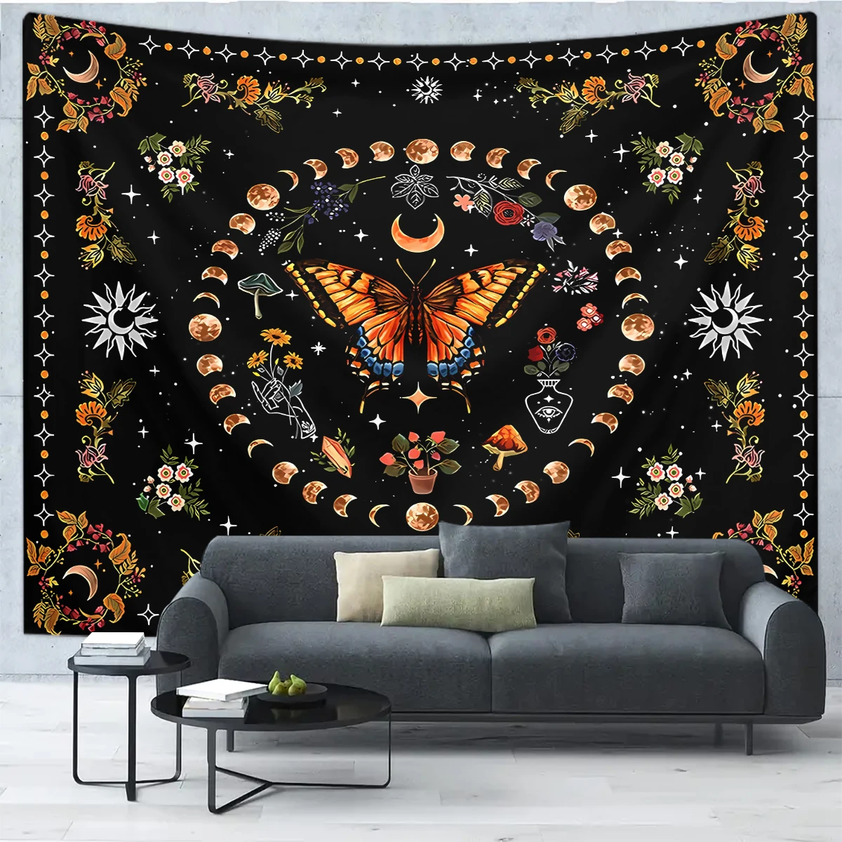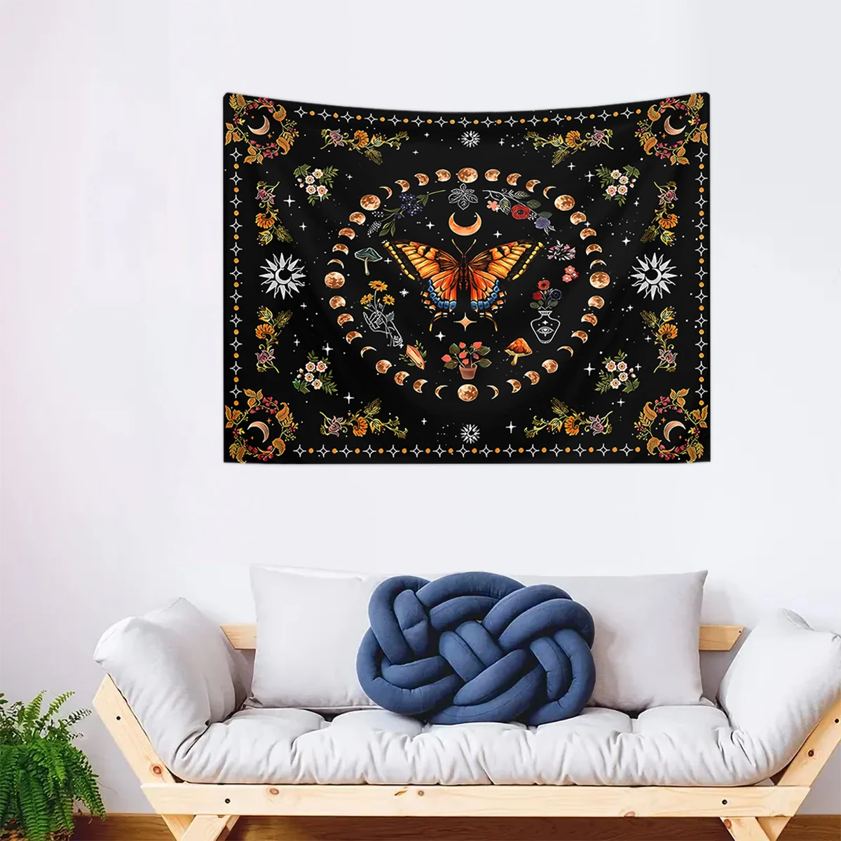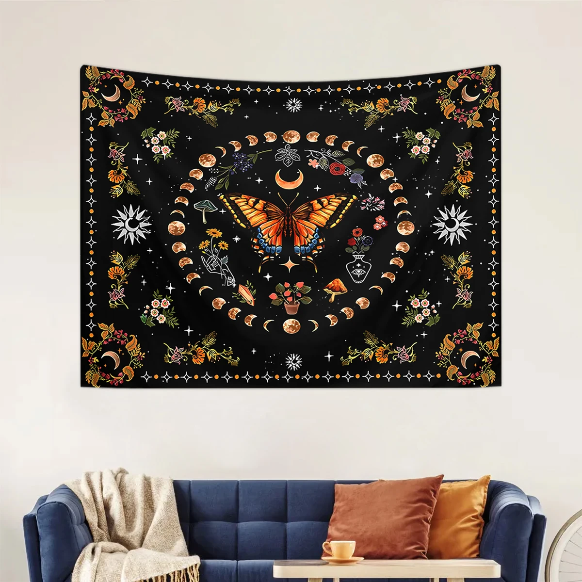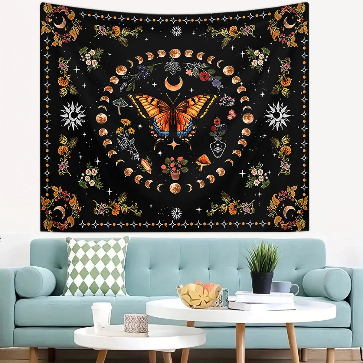 1pc Butterfly, Moon, Flower Tapestry, Plant Flower Bohemian Tapestry, Bedroom Aesthetics Retro Moonphase Starry Sky Tapestry