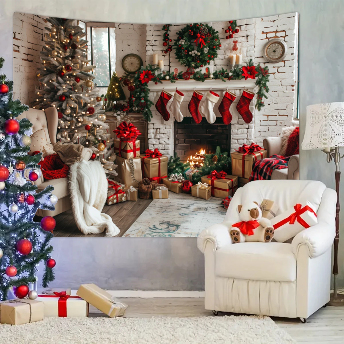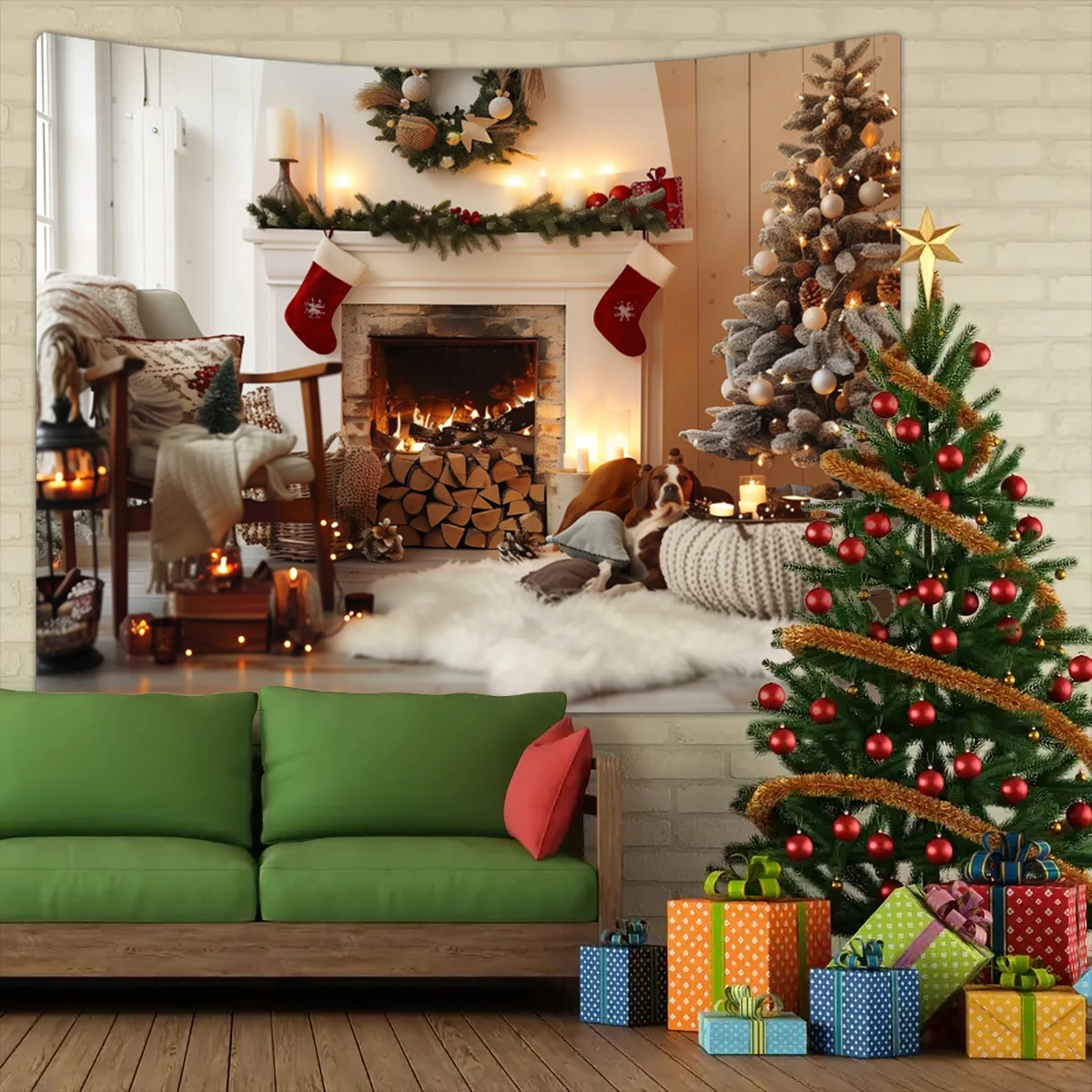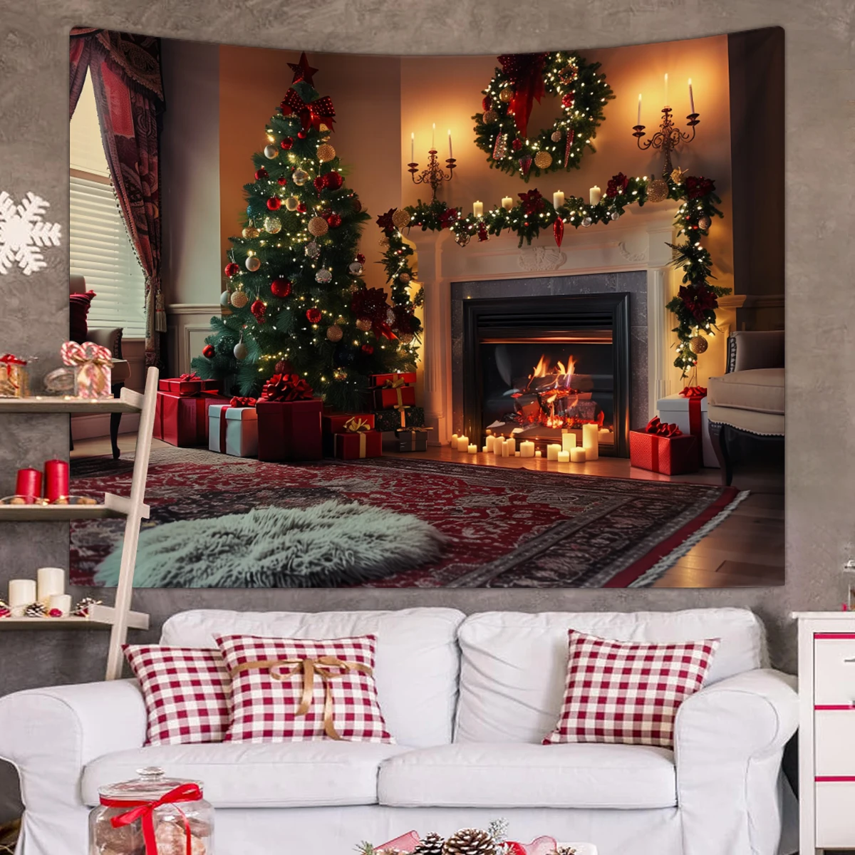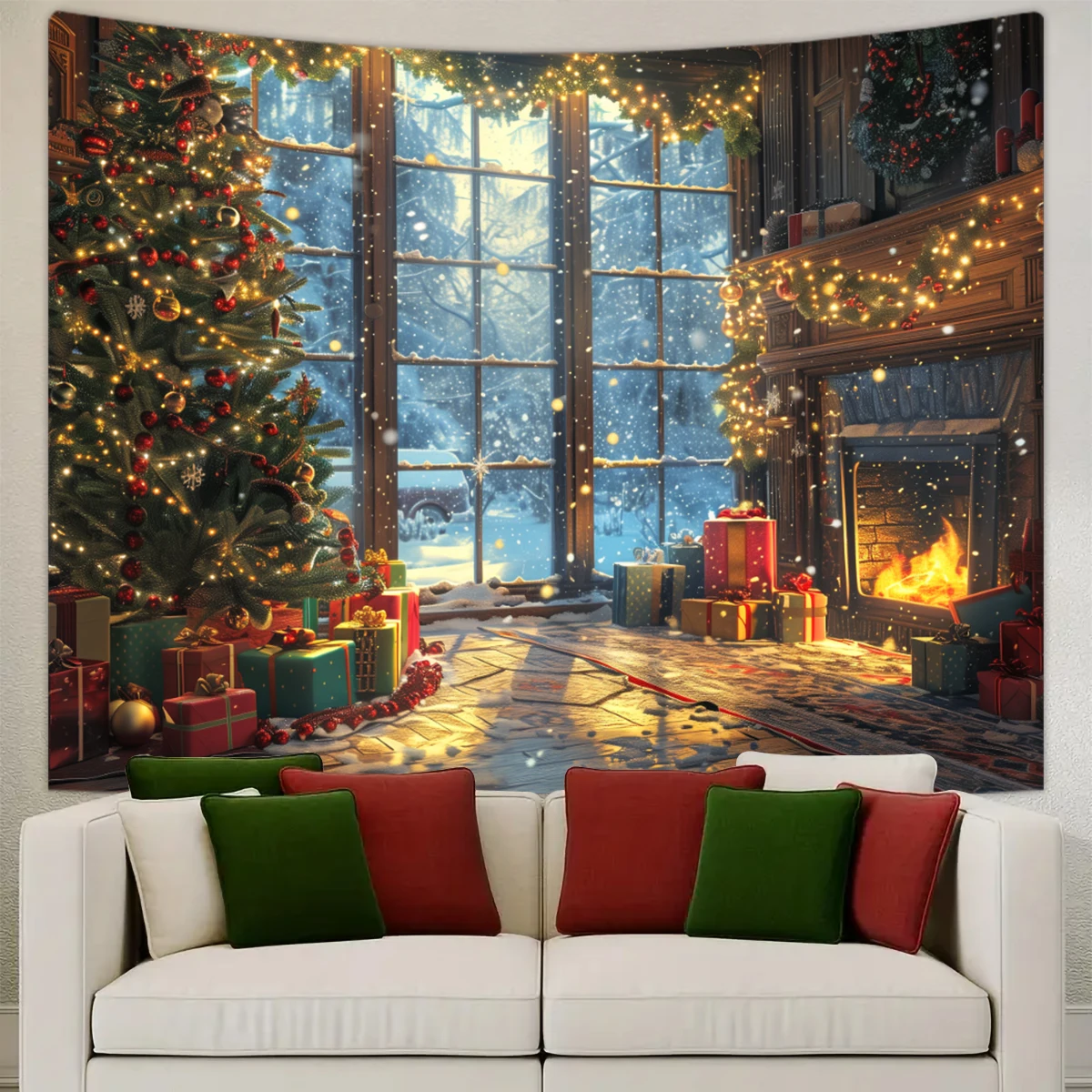 1pc Christmas tapestry, snow background banner outside the Christmas tree window, Christmas fireplace tapestry