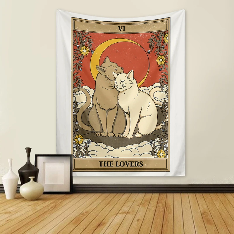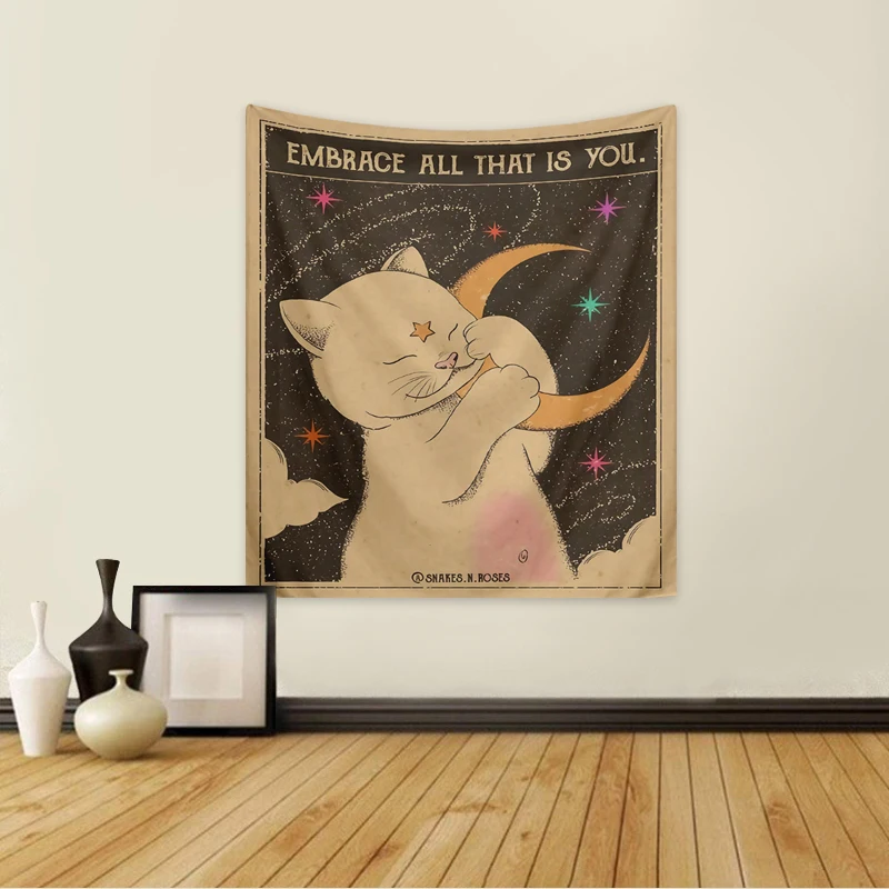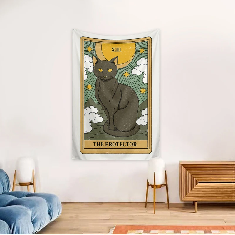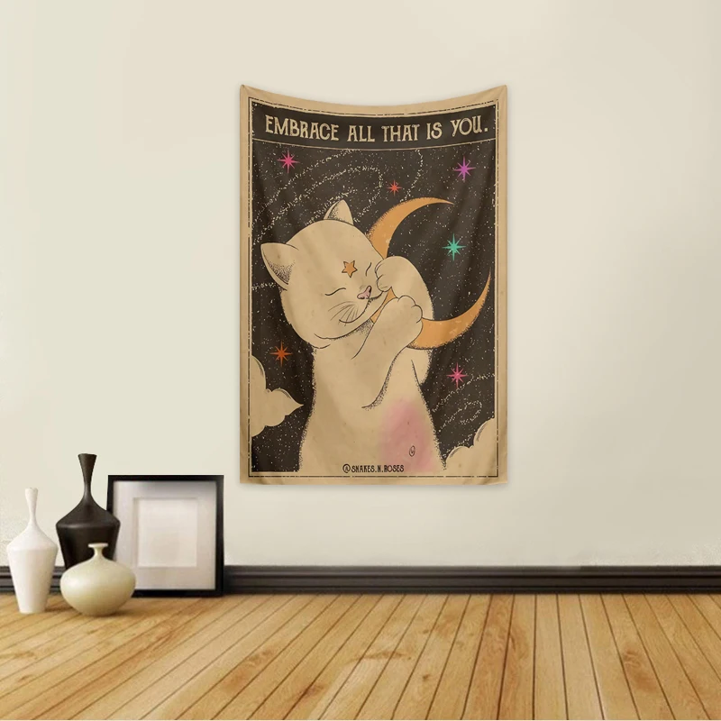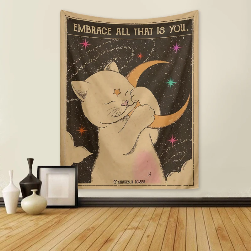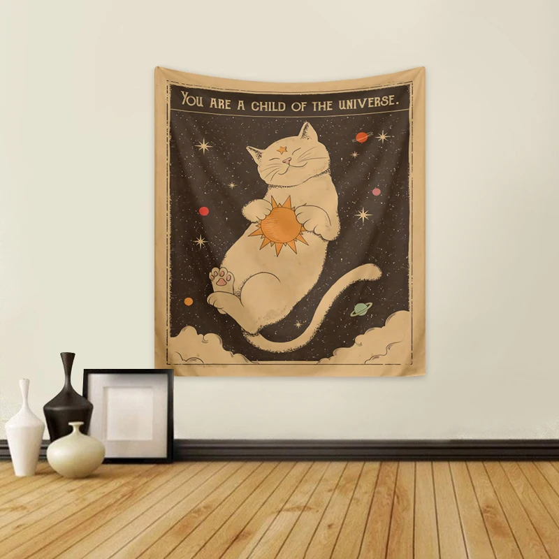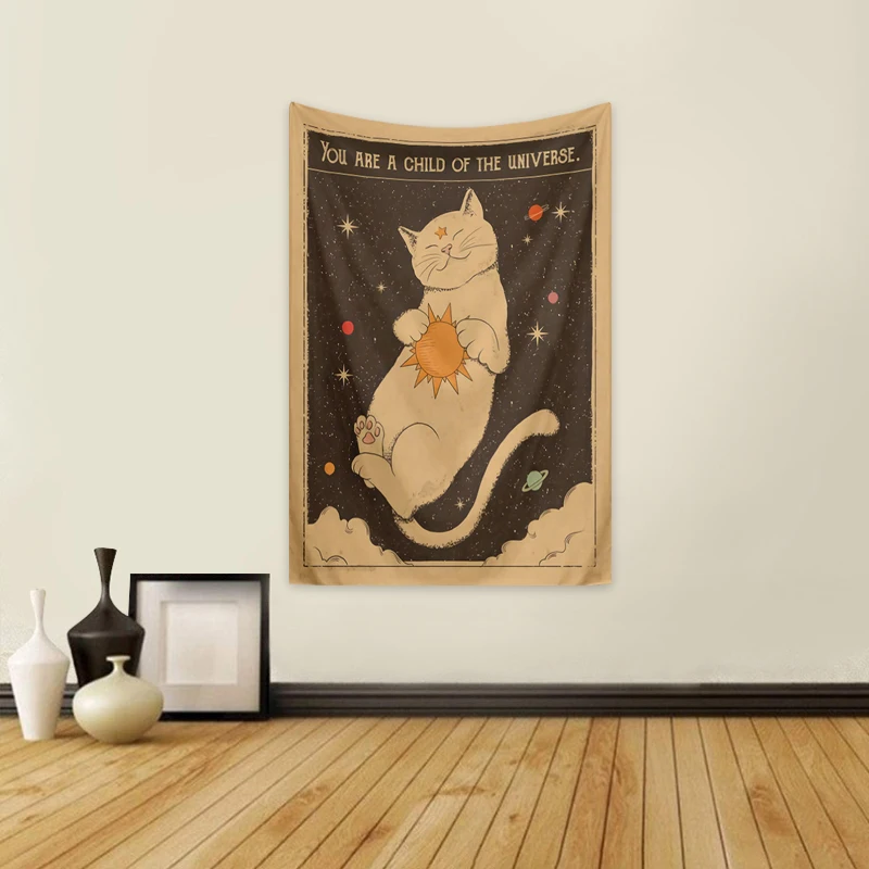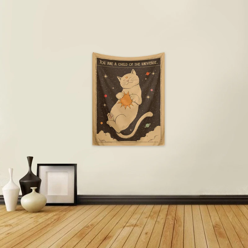 1pc Tarot Cat Tapestry, Moon Phase Sun Universe Starry Sky Tapestry, Cute Cat Wall Hanging