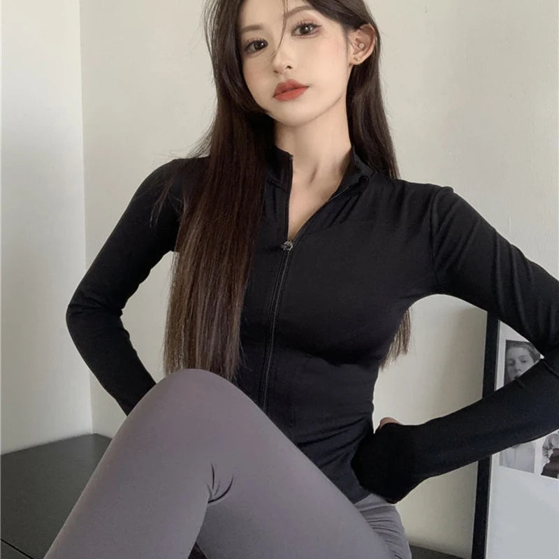 2025 New Slim Fit Long Sleeve T Shirt Women Wild Zipper Up Waist Slimming Yoga Tshirt Woman Tight Stand Collar Crop Tops Female