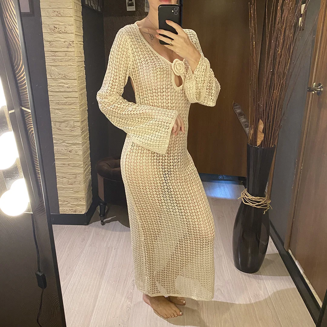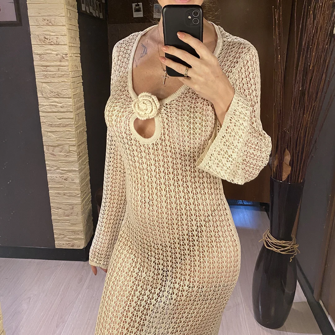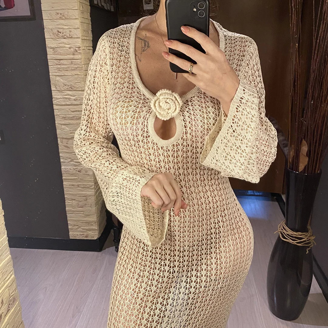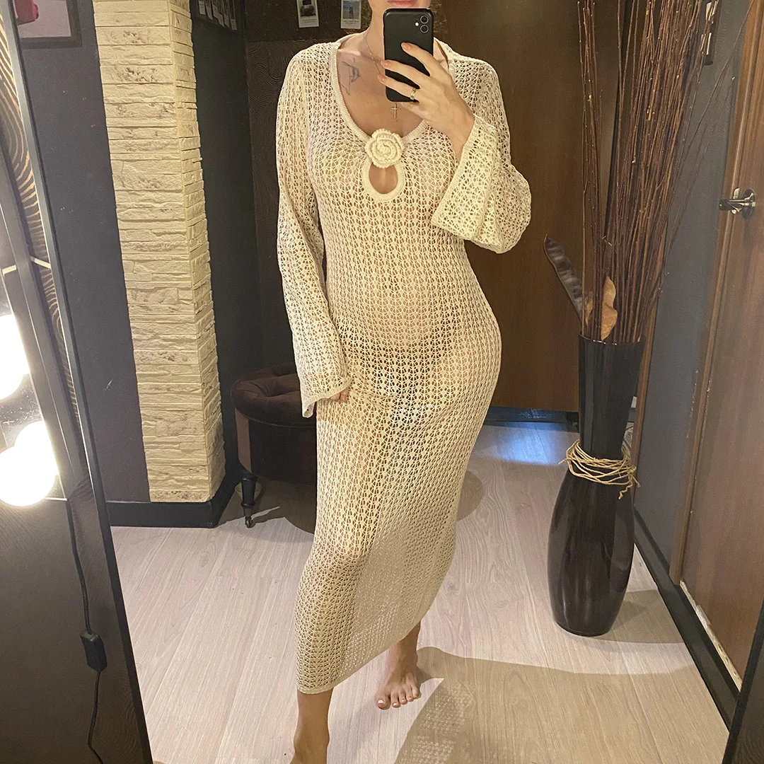 3D Flower V Neck Long Sleeve Crochet Knitted Tunic Beach Cover Up Cover-ups Beach Dress Beach Wear Beachwear Female Women V5852