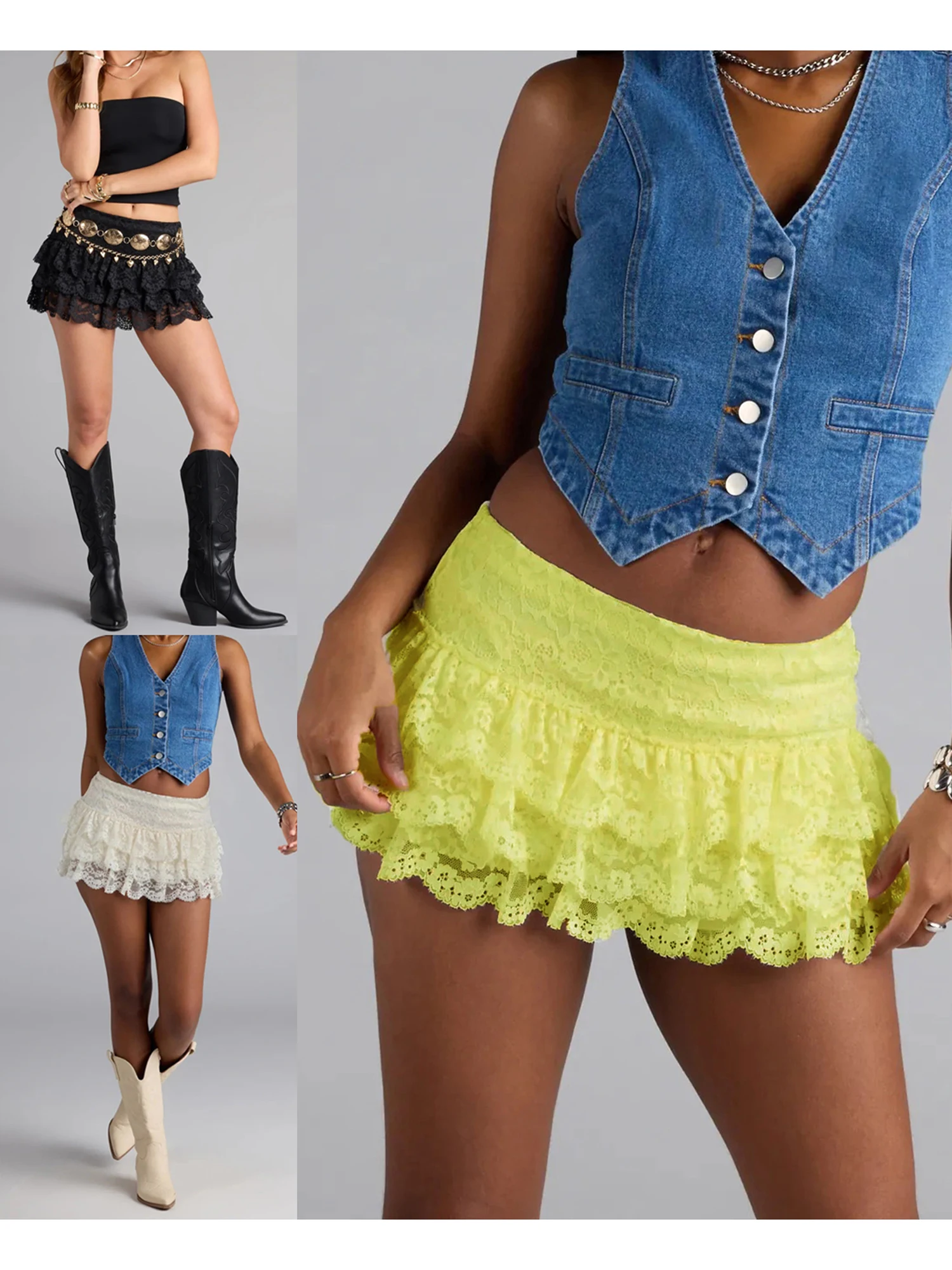 Women Summer Mini Skirts Casual Elegant Low Rise Layered Ruffle Lace Skirt for Beach Vacation ClubSize (cm)