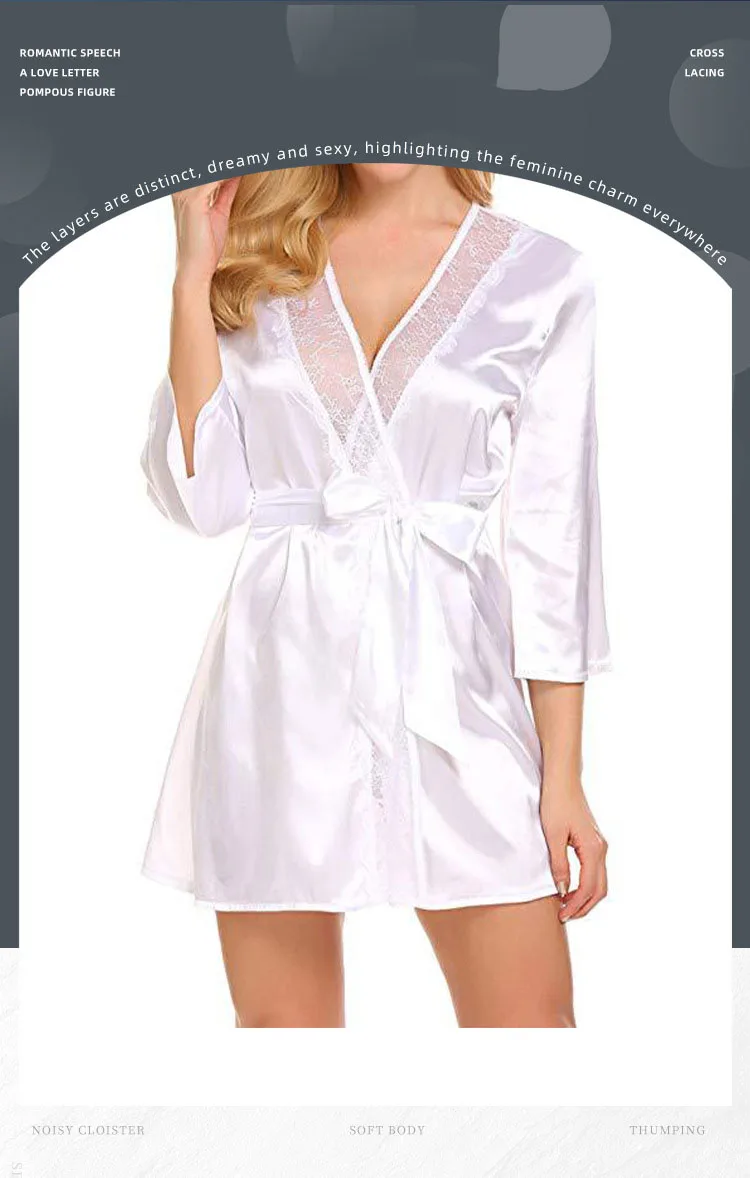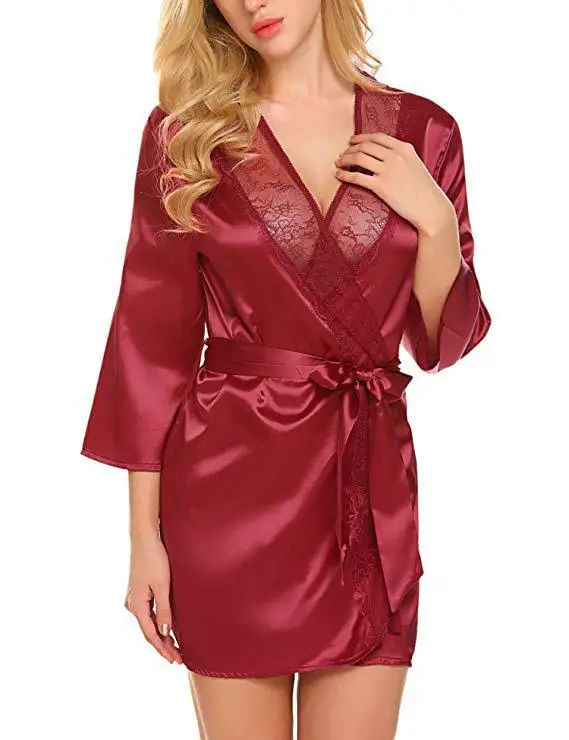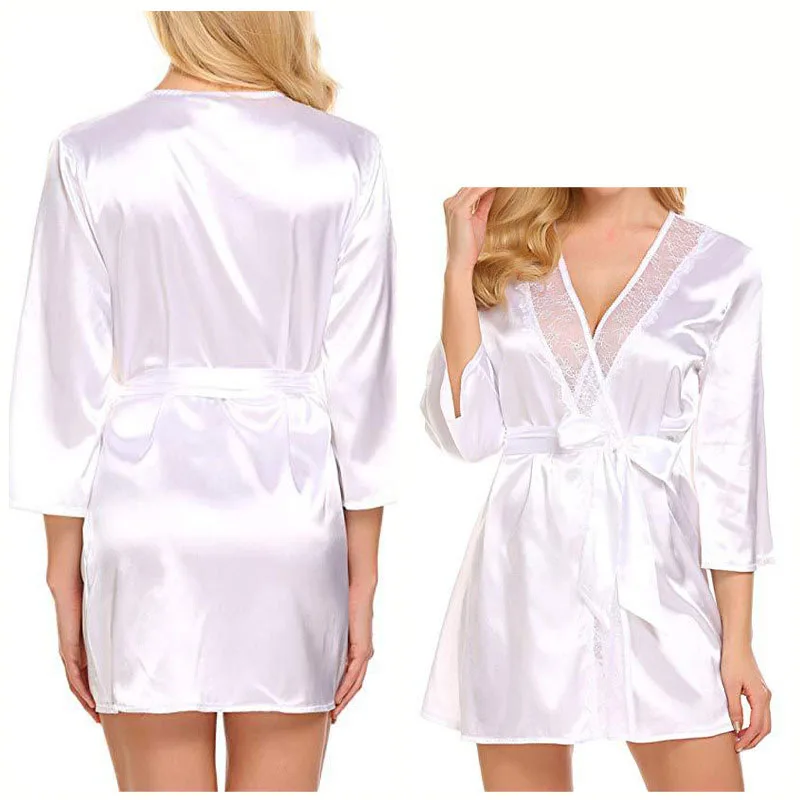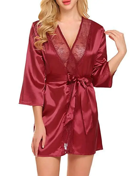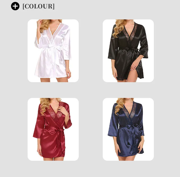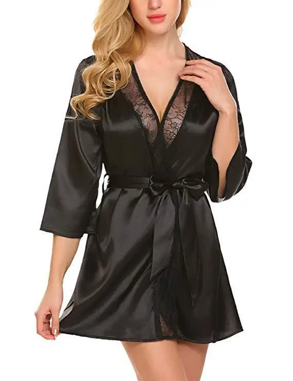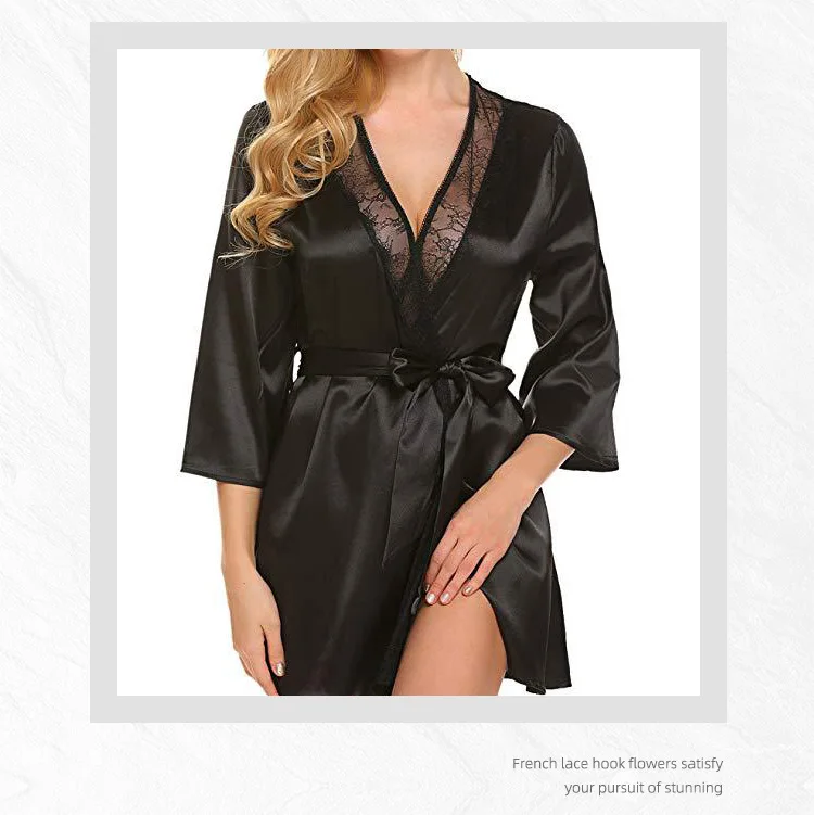 Women Sexy Lace Satin Robe Sleepwear Short Nightgown Kimono Bathrobe Lingerie Nighty Dress Soft Comfortable Black Plus Size