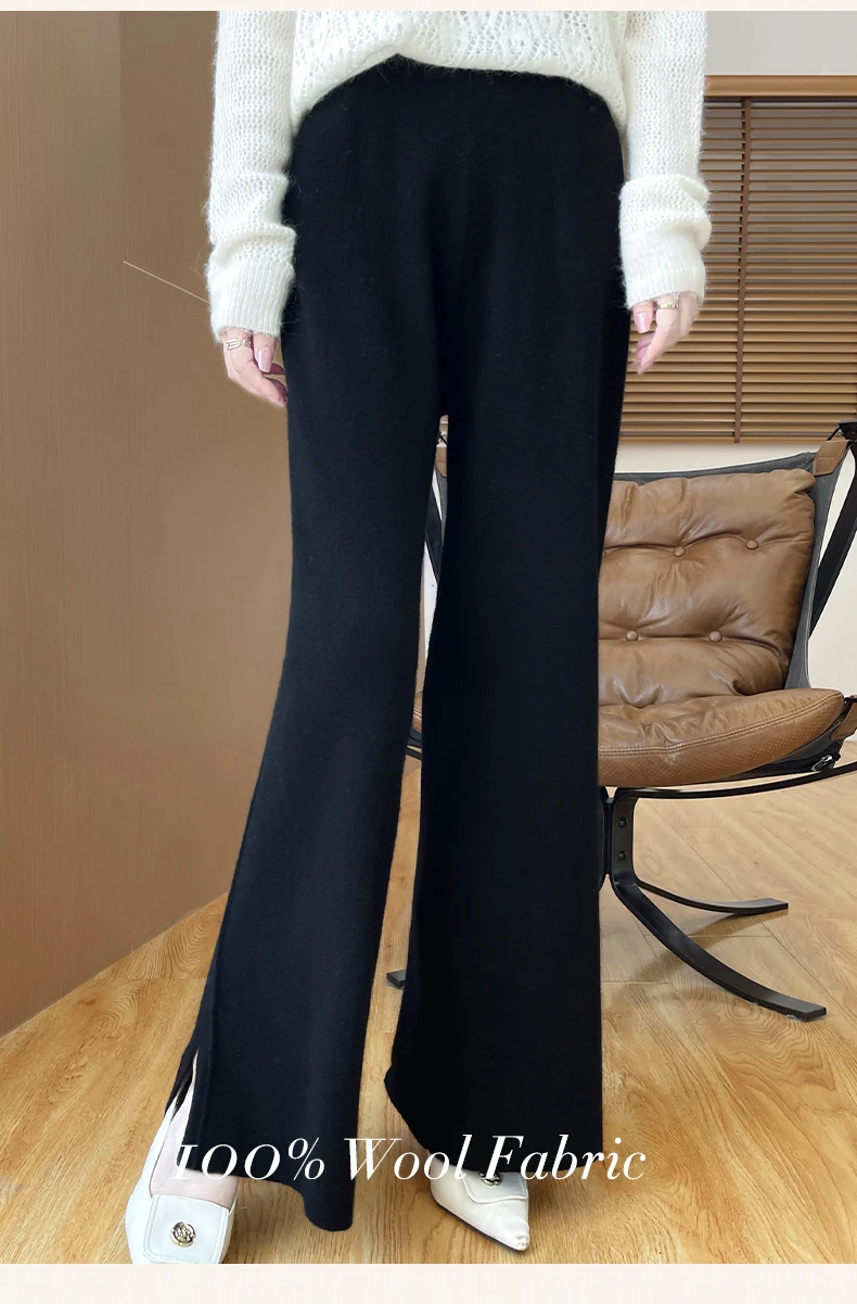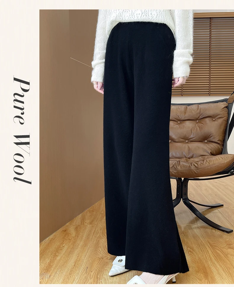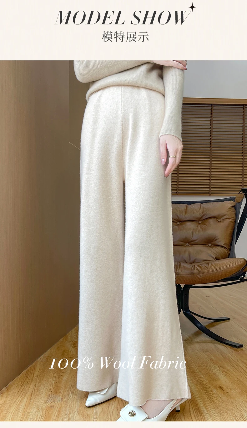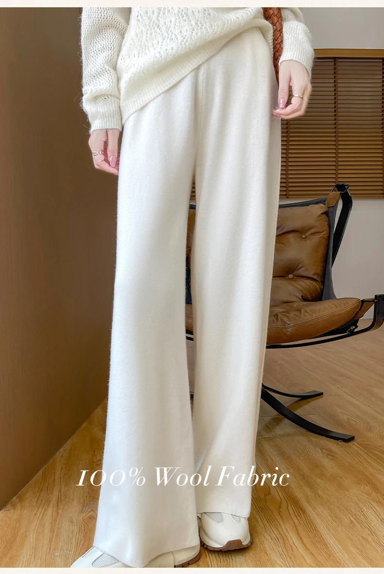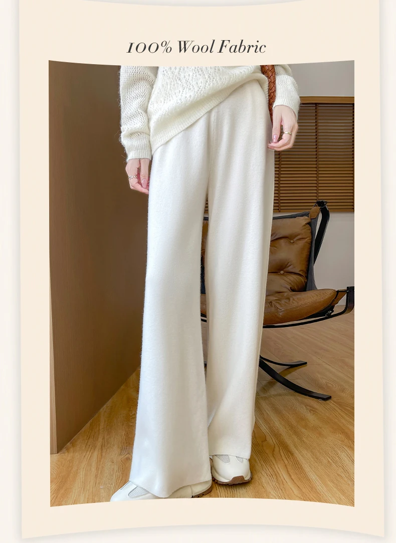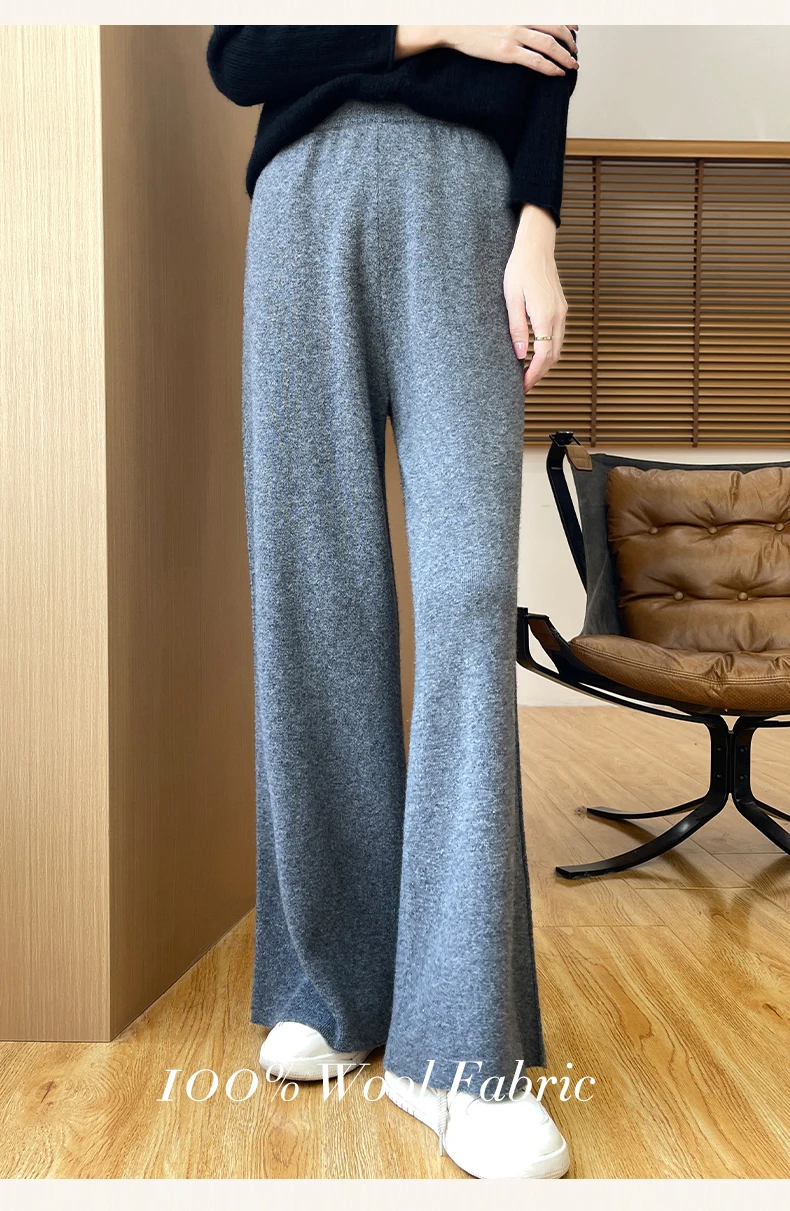 Women Straight Flared Pants 100% Merino Wool Knitted Thicken Loose Pants Autumn Winter Office Lady Elastic Waist Wool Trousers