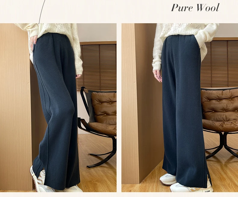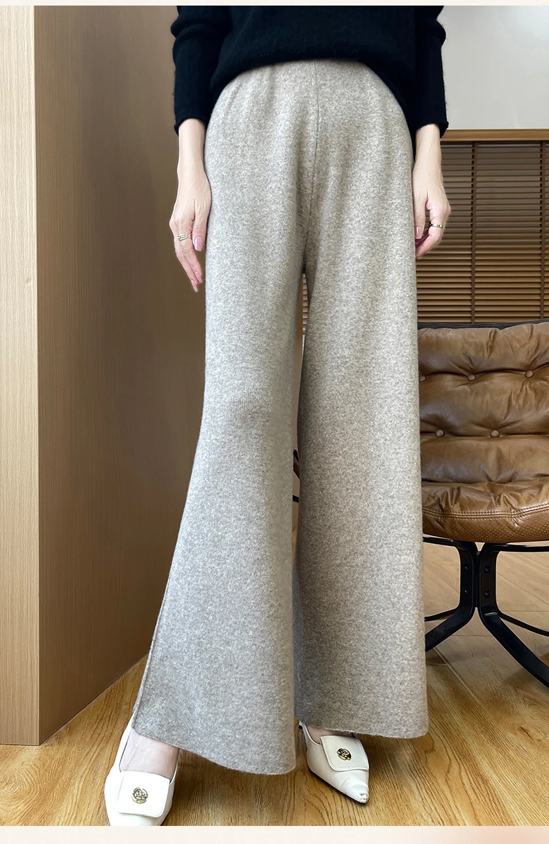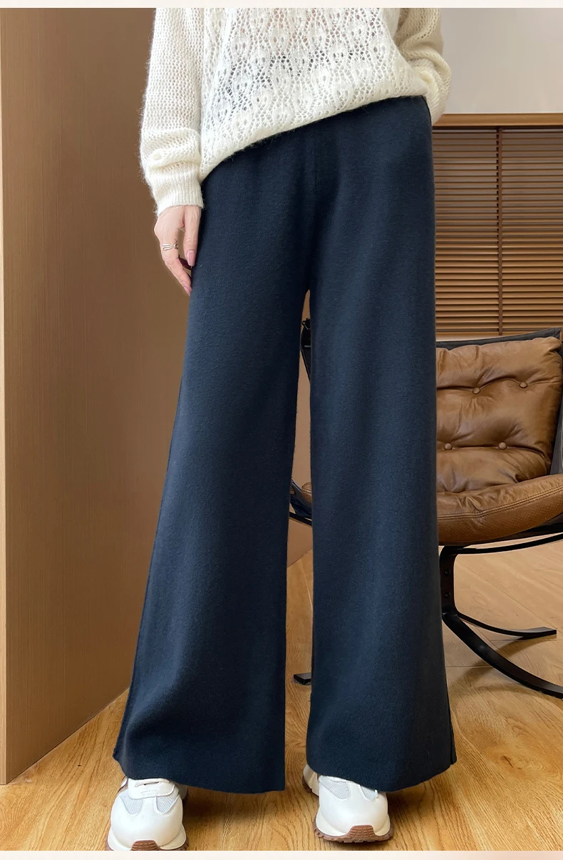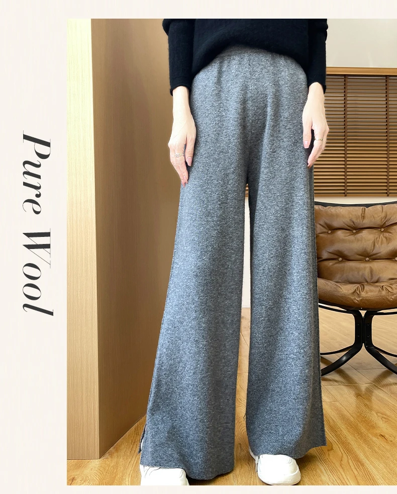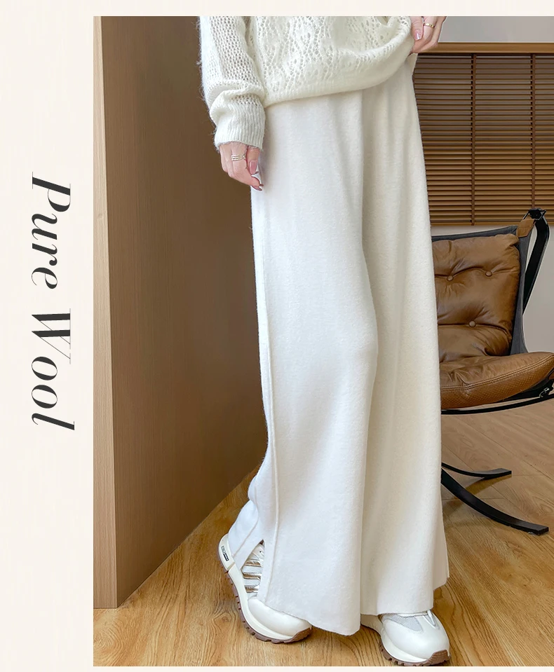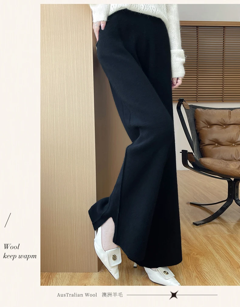 Women Straight Flared Pants 100% Merino Wool Knitted Thicken Loose Pants Autumn Winter Office Lady Elastic Waist Wool Trousers