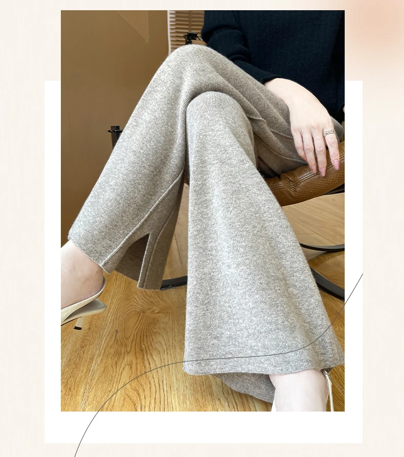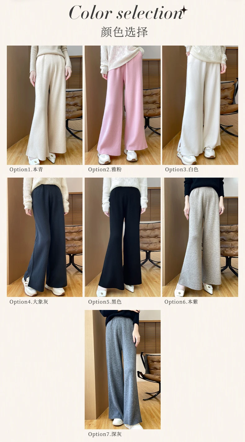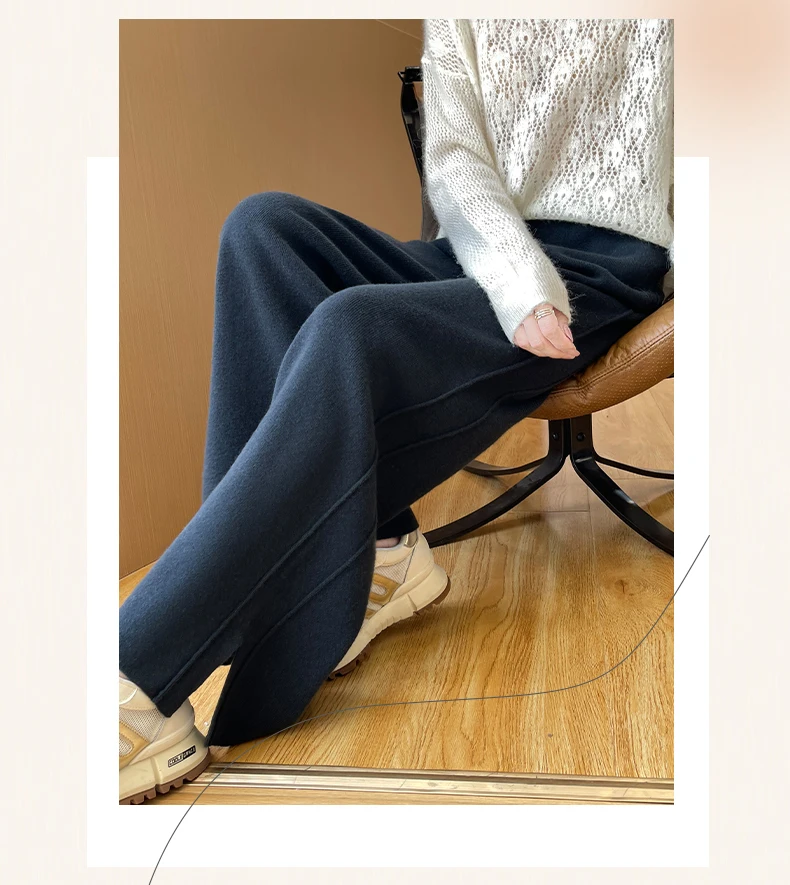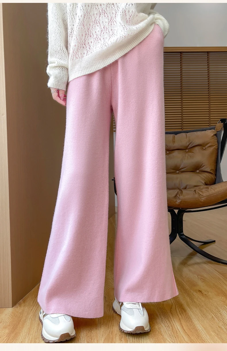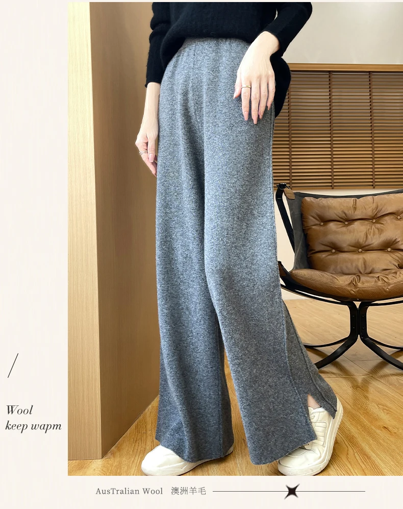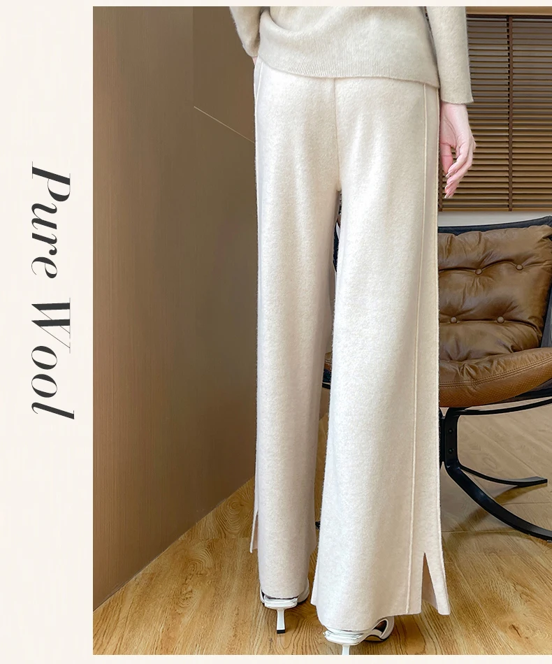 Women Straight Flared Pants 100% Merino Wool Knitted Thicken Loose Pants Autumn Winter Office Lady Elastic Waist Wool Trousers