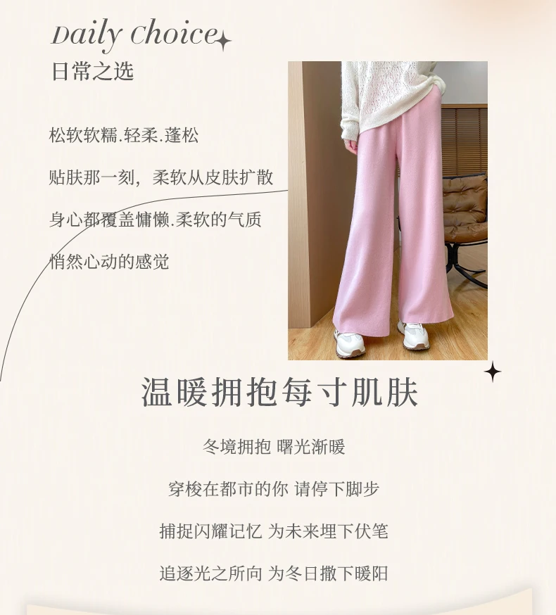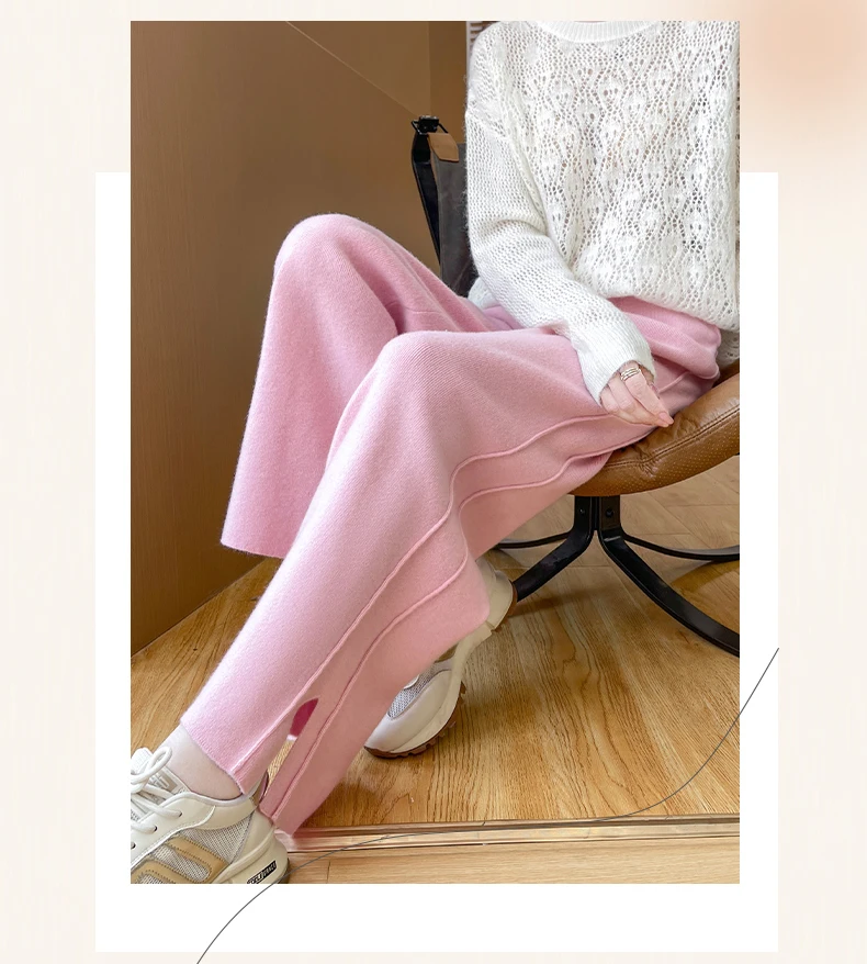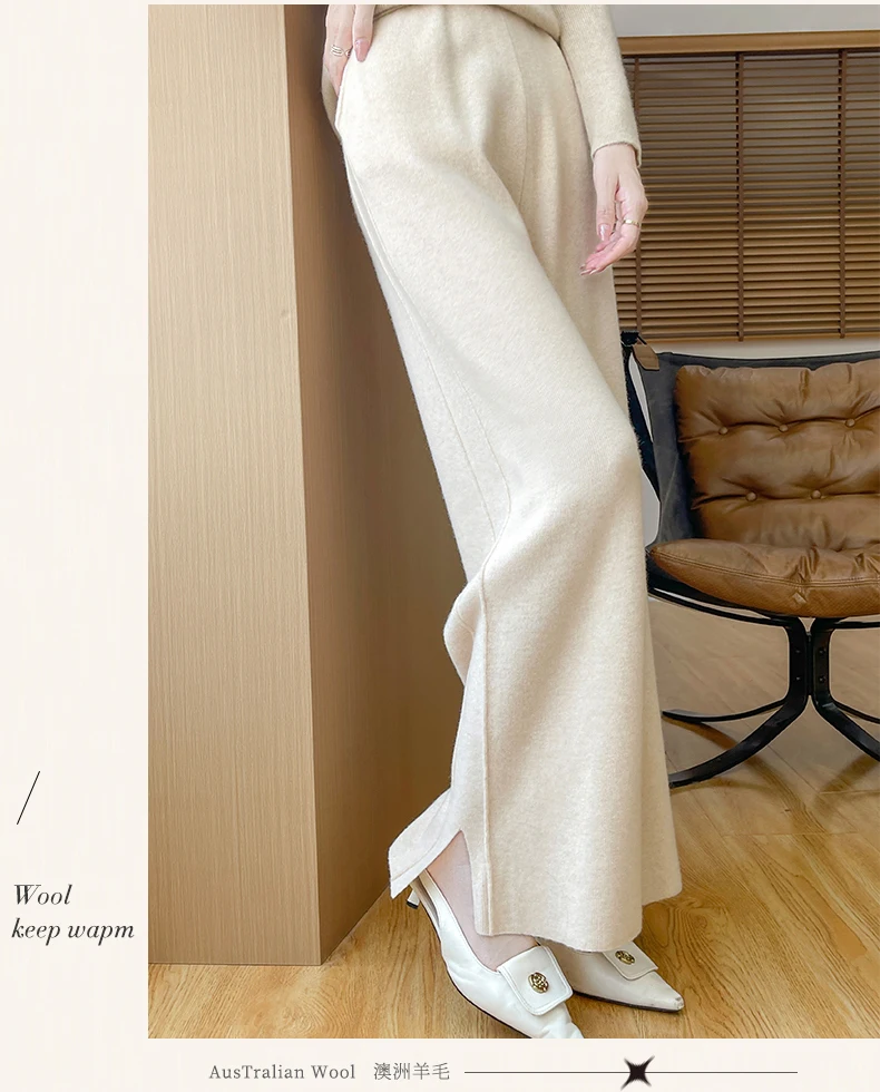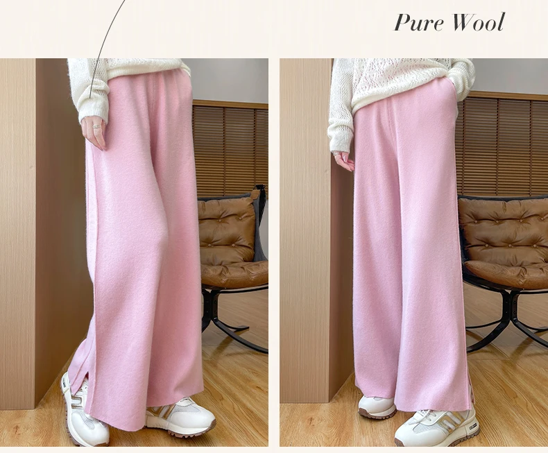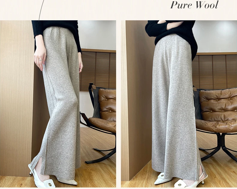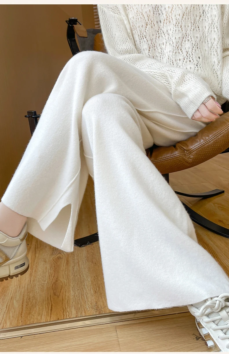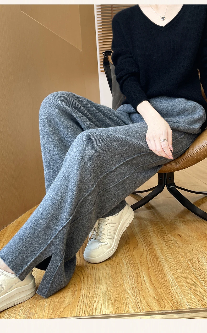 Women Straight Flared Pants 100% Merino Wool Knitted Thicken Loose Pants Autumn Winter Office Lady Elastic Waist Wool Trousers