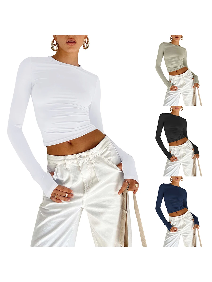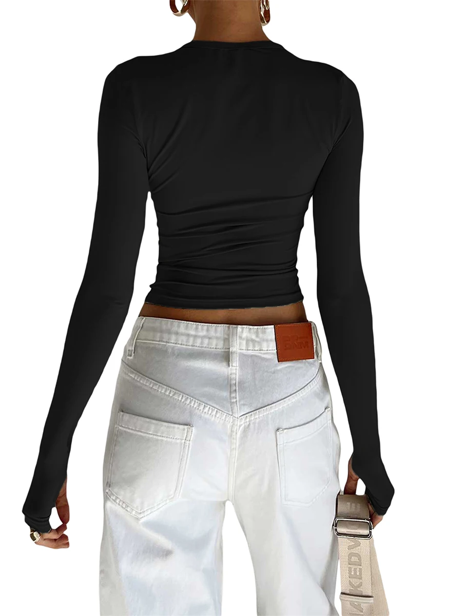 Women T-shirt, Long Sleeve Crew Neck Solid Slim Fit Ladies Crop Top with Thumb Holes for Daily Street