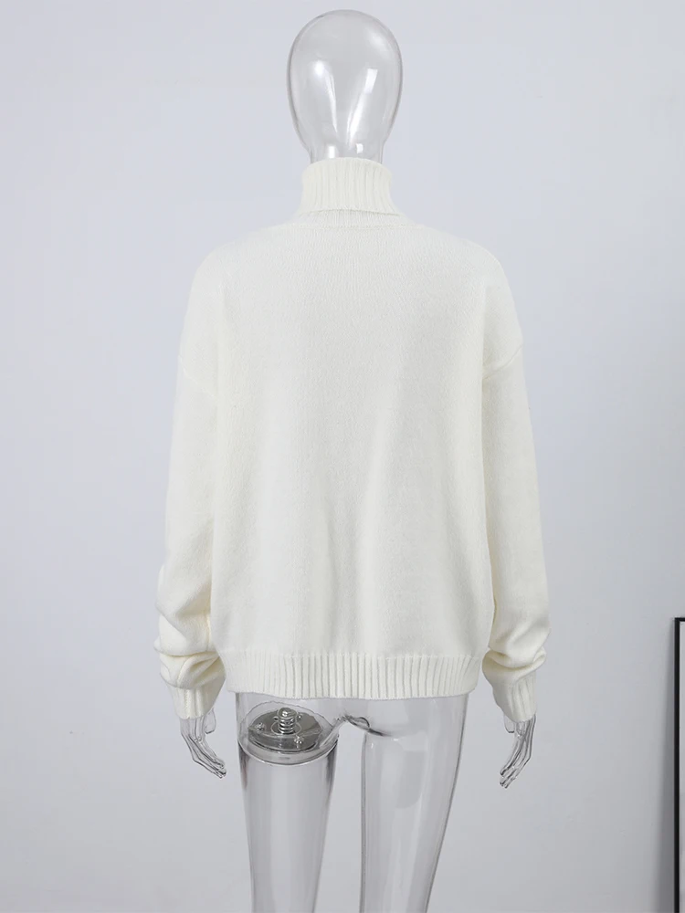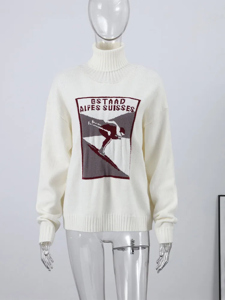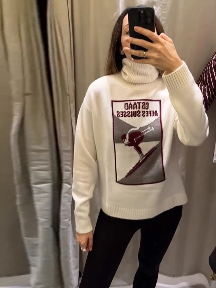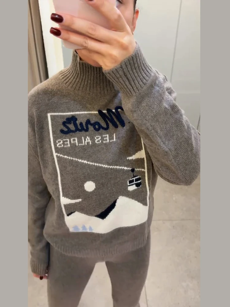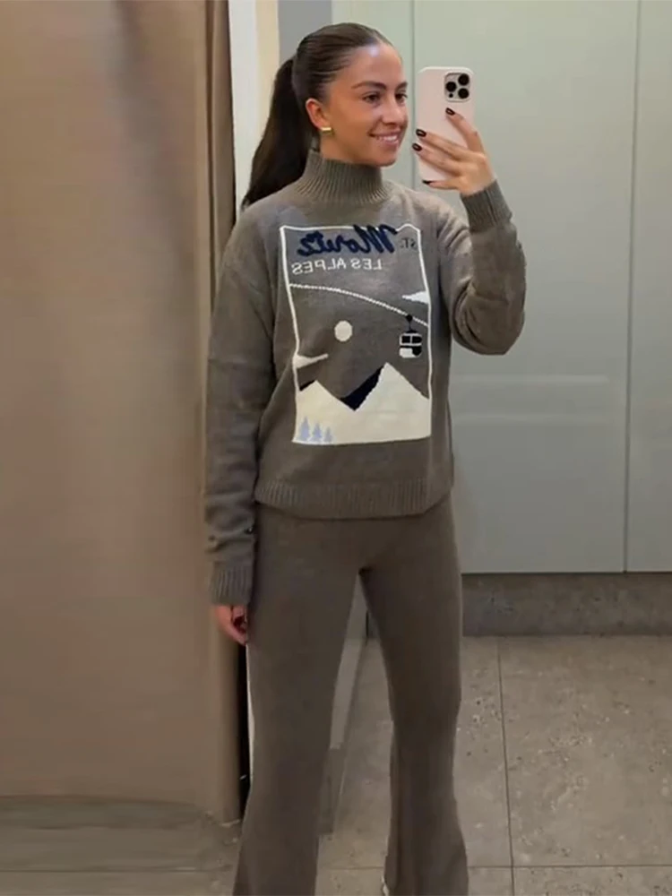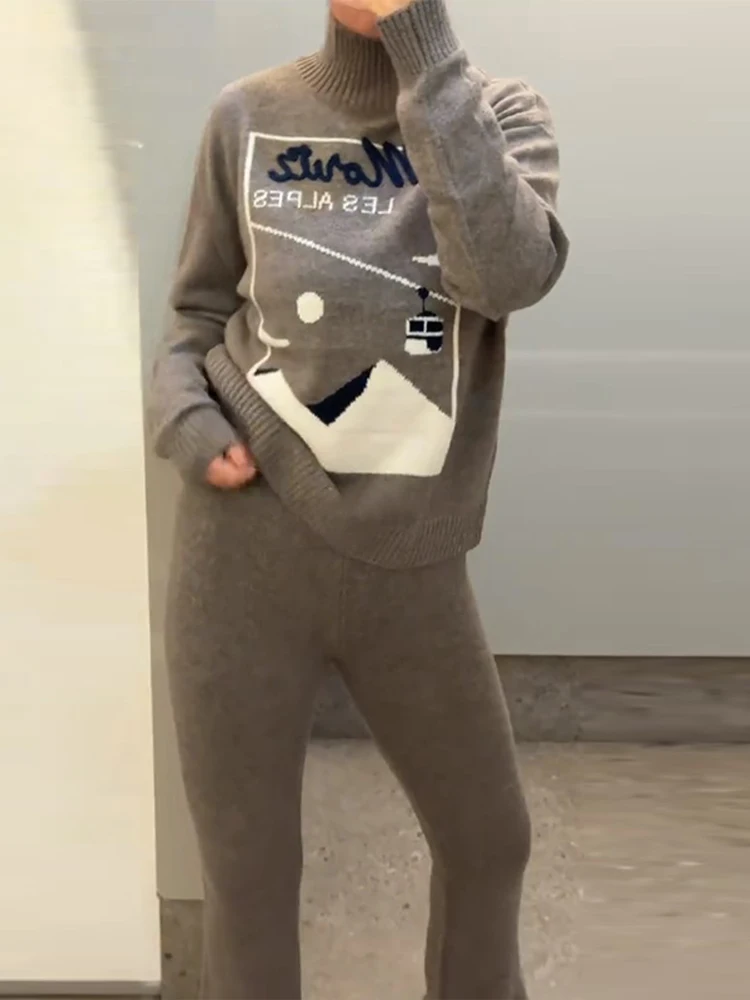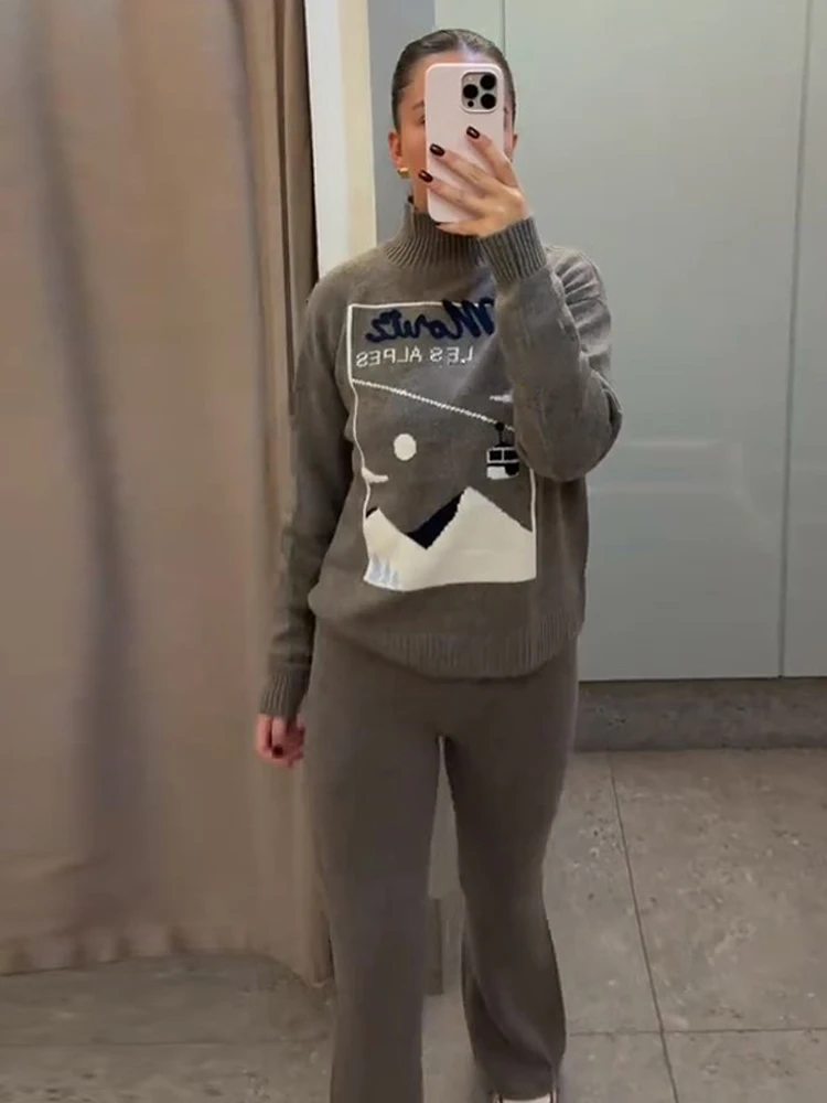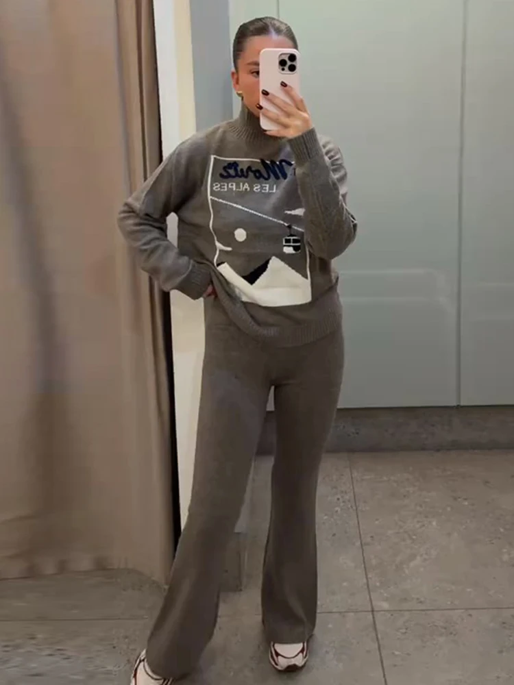 Women's 2 Pcs Suits Printed Pullover Sweater Pants Sets Street Female Turtleneck Long Sleeve Tops High Waist Trousers New Outfit