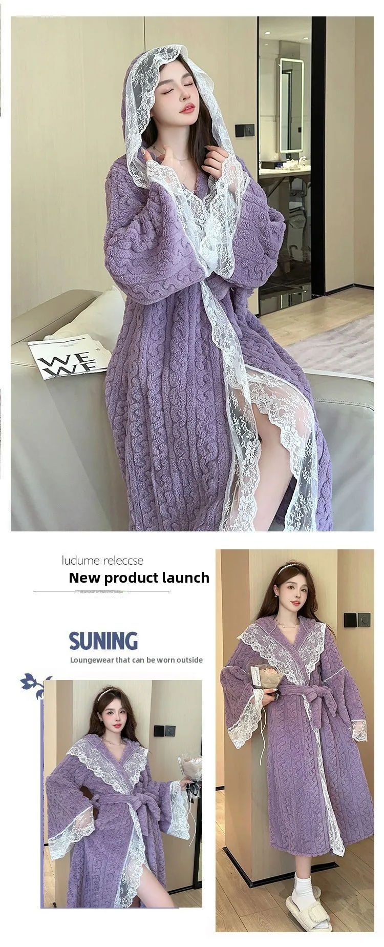 Women's Autumn and Winter Delicate Lace Edge Nightgown, Small Fragrant Pajamas, Piled and Thickened To Keep Warm Bath Robe Women