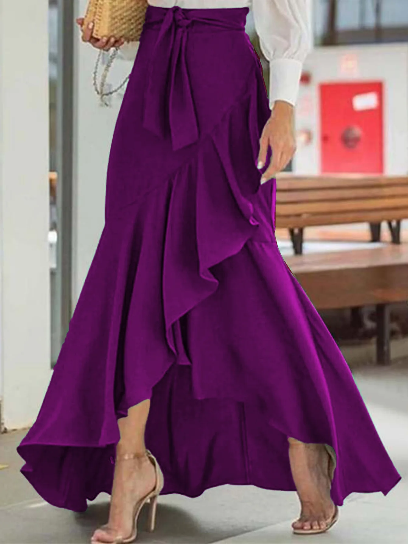 Women's Elegant Solid High Waist Mermaid Skirt Fashion Elastic Irregular Ruffle Long Skirt Casual Bow Tie Detail Maxi Skirt 2025