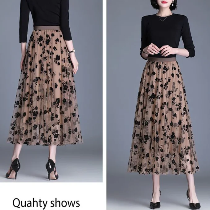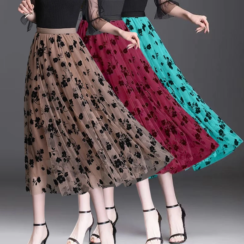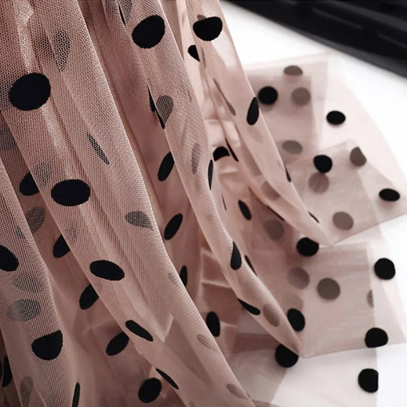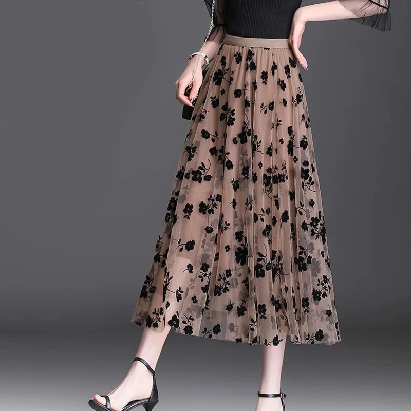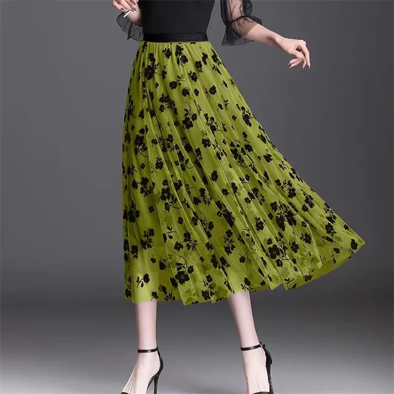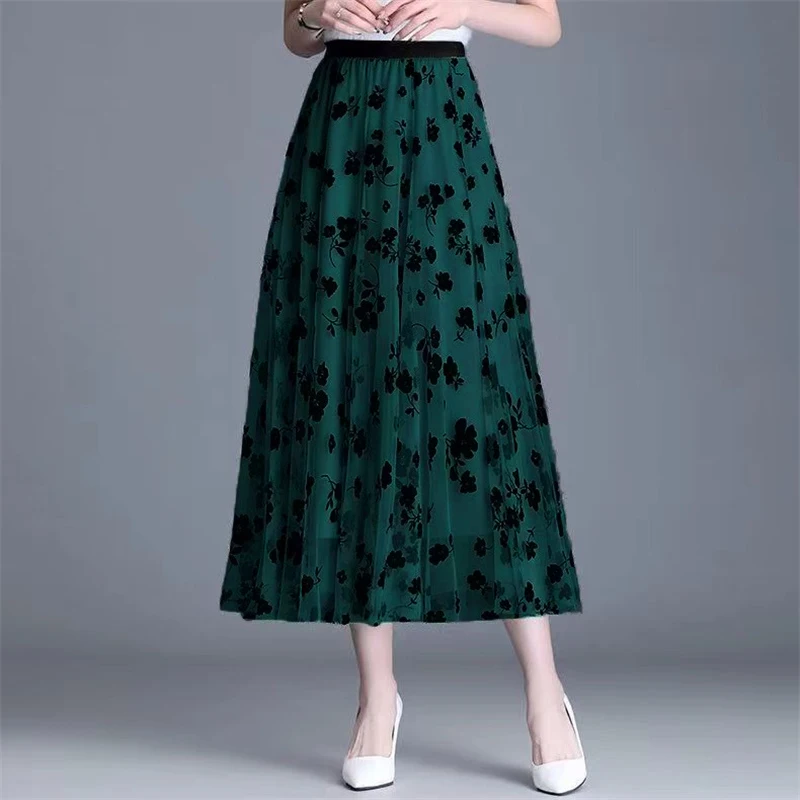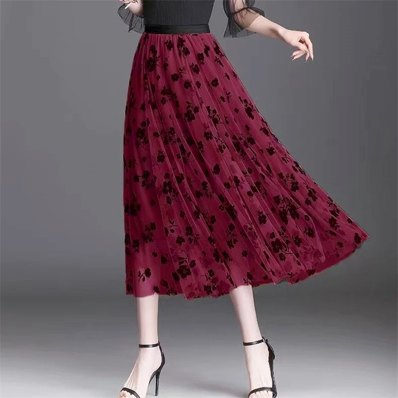 Women's Mesh Flower Skirts 2024 Autumn Winter Lace Flocking Big Swing Elastic High Waist Fashion Elegant A-line White Skirt Dot