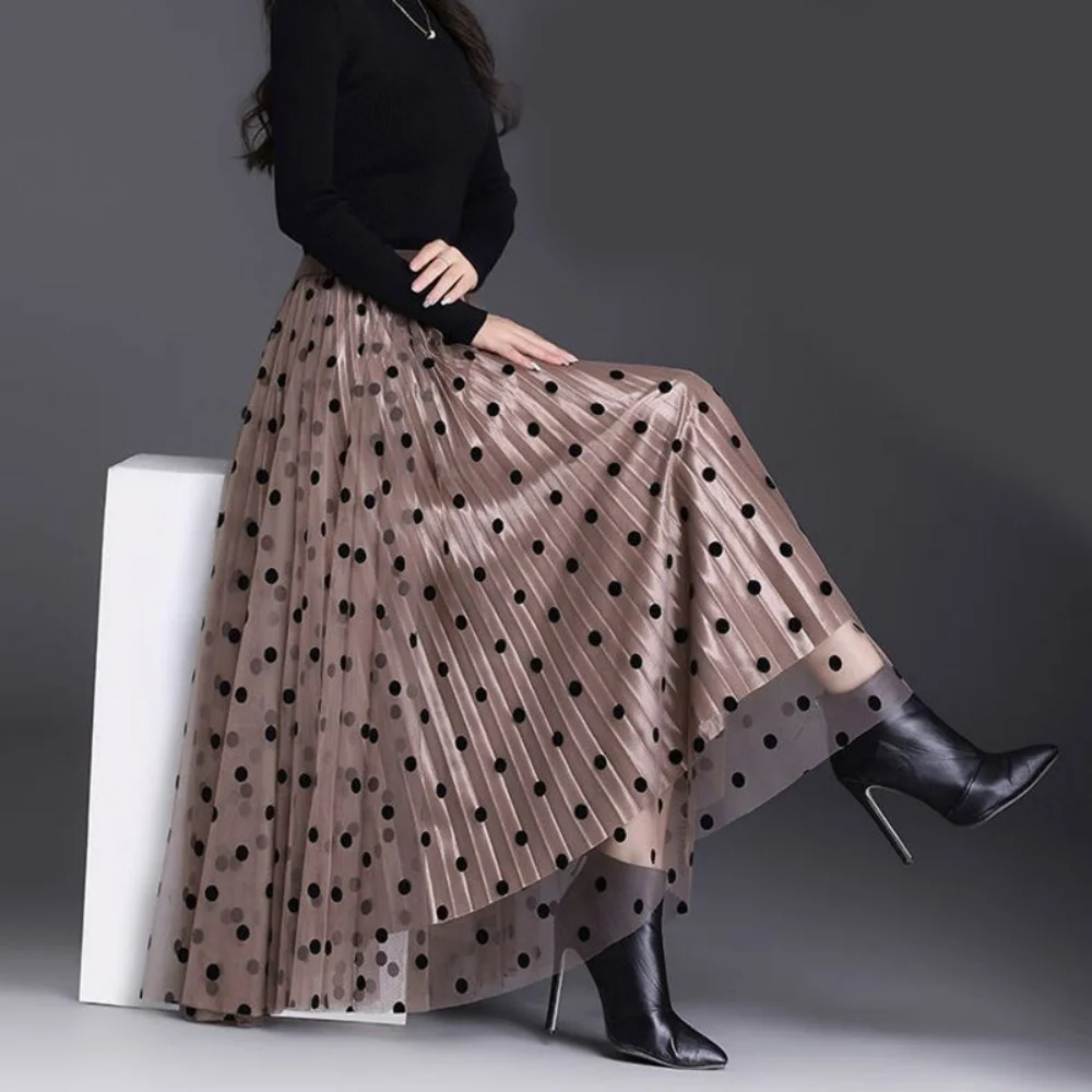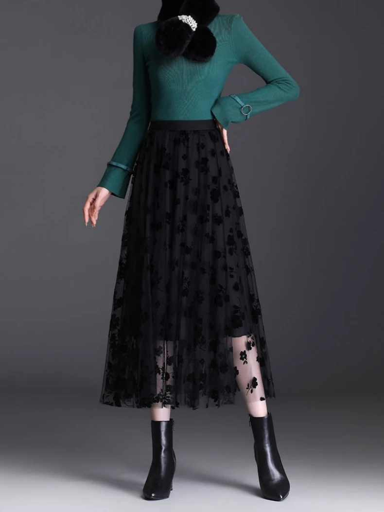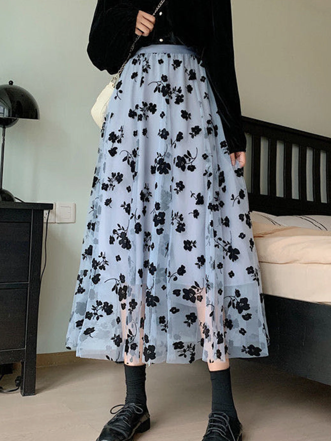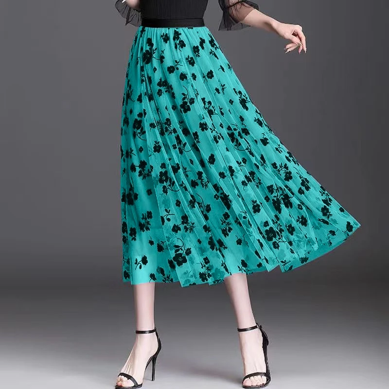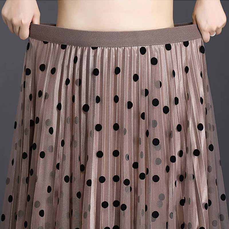 Women's Mesh Flower Skirts 2024 Autumn Winter Lace Flocking Big Swing Elastic High Waist Fashion Elegant A-line White Skirt Dot