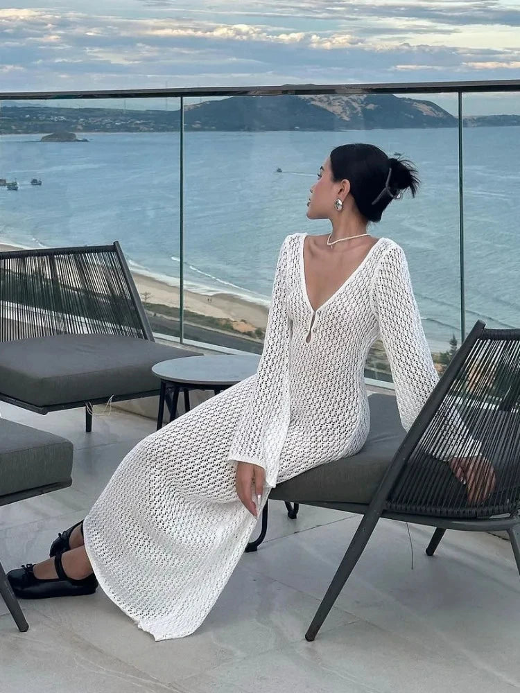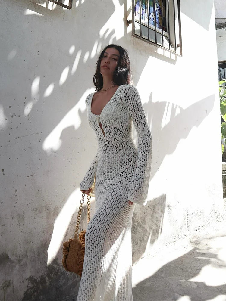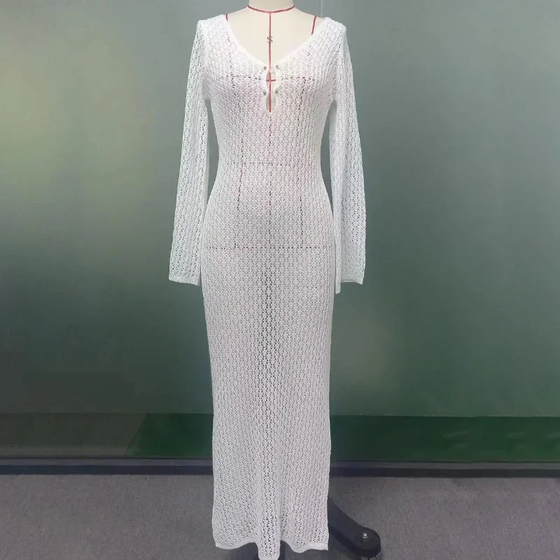 Women's Openwork Knitted Long Dresses 2024 Summer Beach V-Neck Backless Maxi Dress Bikini Cover-ups Beachwear