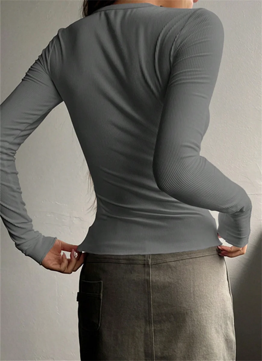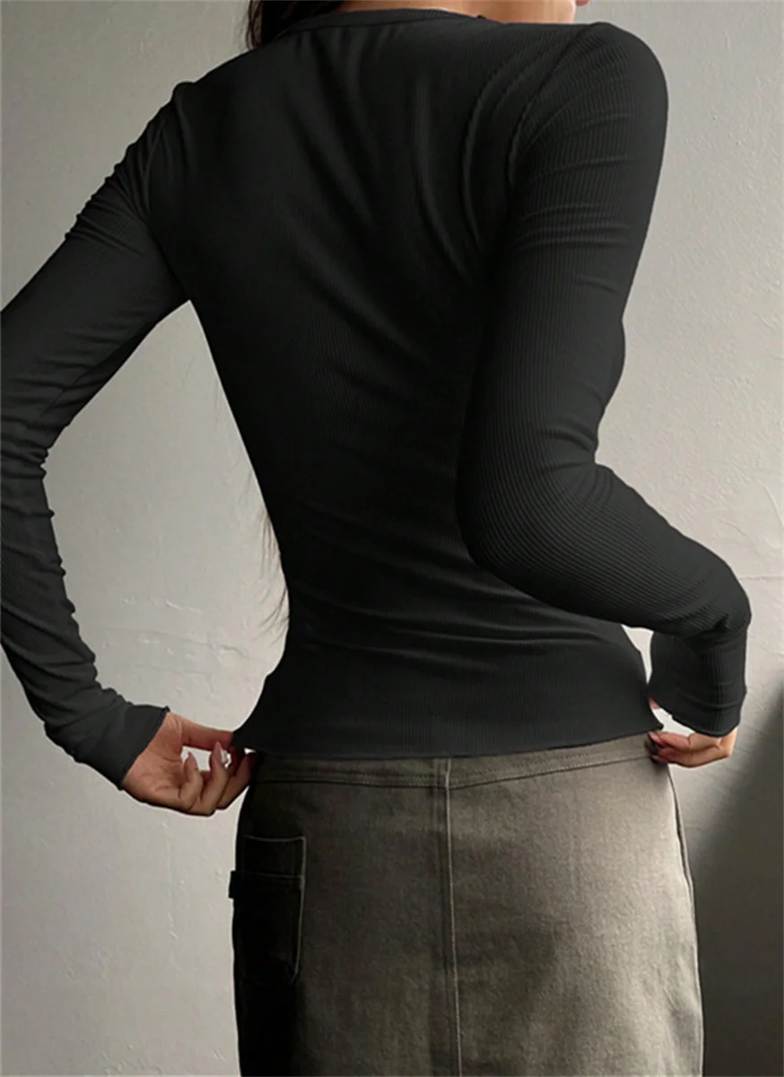 Women's Plain Half Button Front Ribbed Tee Y2K Slim Sexy Basic Pullover Shirt Casual Fit Long Sleeve Round Neck Solid T shirts