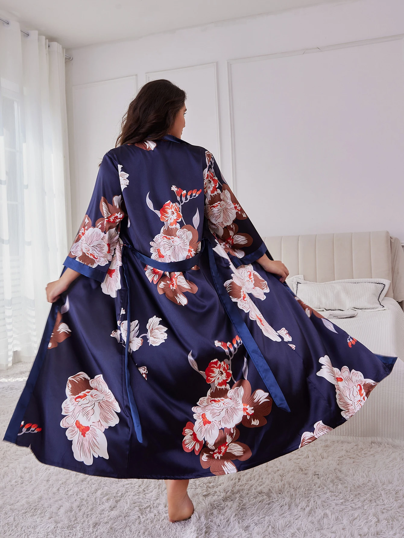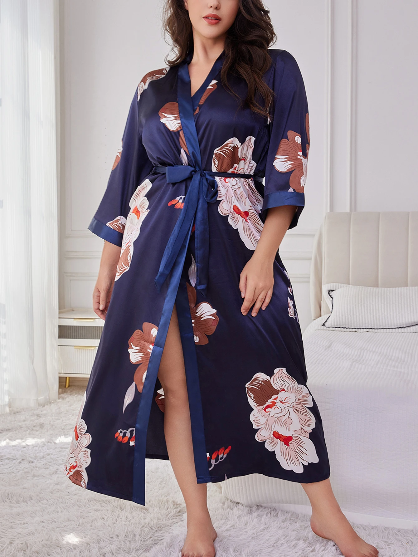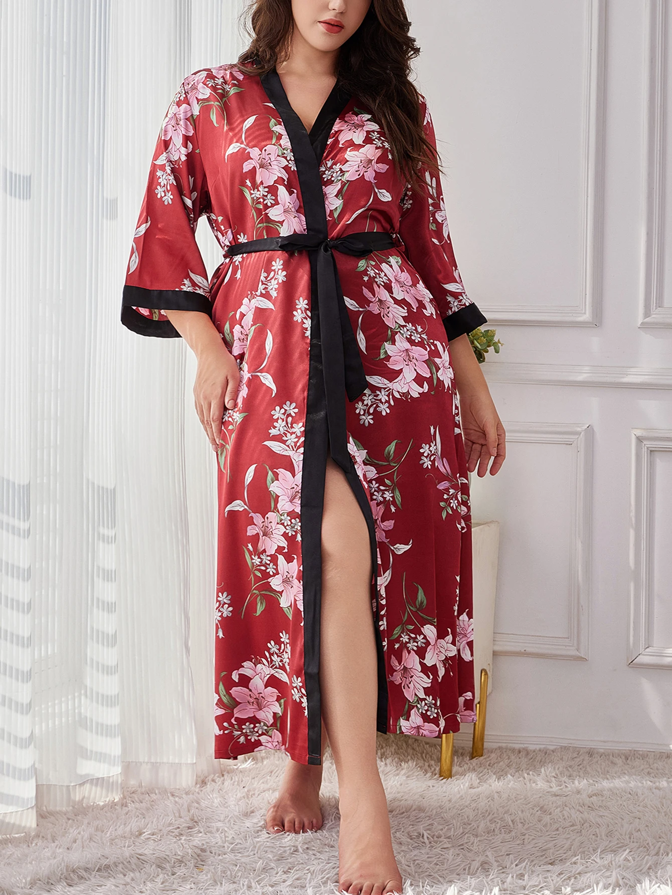 Women's Plus Size Belted Silk Robe Lightweight Random Floral Print Loose Long Sleepwear Fall Winter Loungewear for Curvy Home