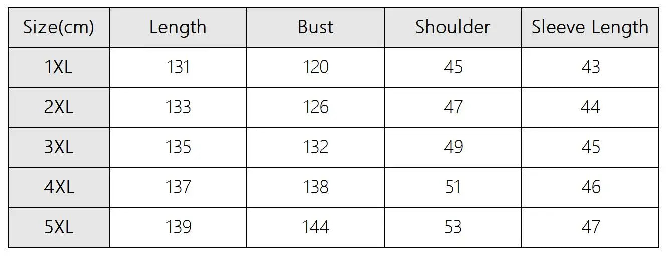 size_info: {"sizeInfoList":[{"length":{"cm":"120","inch":"47.24"},"size":"1XL","vid":-1},{"length":{"cm":"126","inch":"49.61"},"size":"2XL","vid":-2},{"length":{"cm":"132","inch":"51.97"},"size":"3XL","vid":-3},{"length":{"cm":"138","inch":"54.33"},"size":"4XL","vid":-4},{"length":{"cm":"144","inch":"56.69"},"size":"5XL","vid":-5}]}