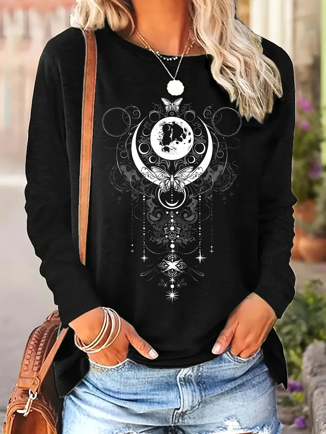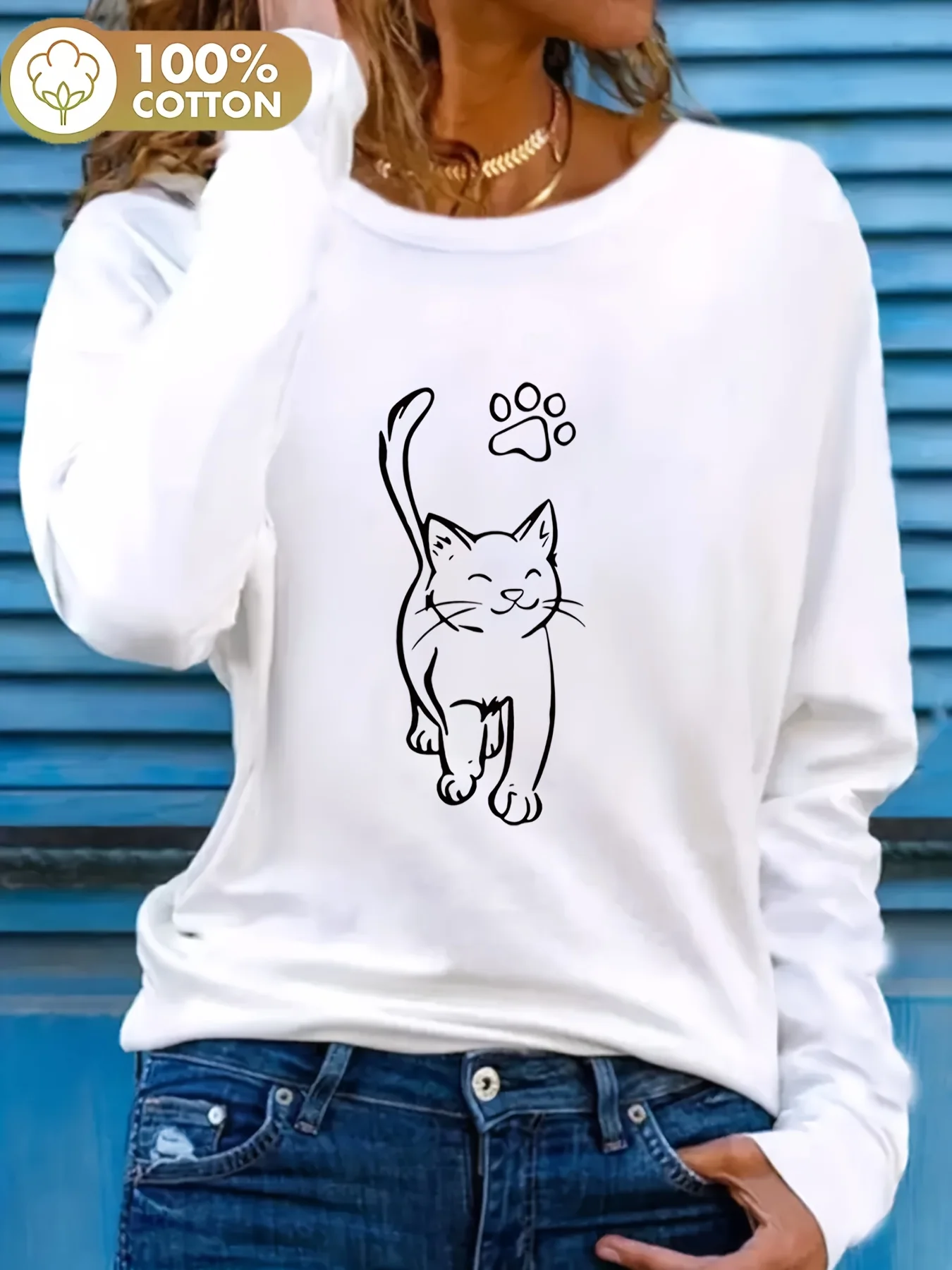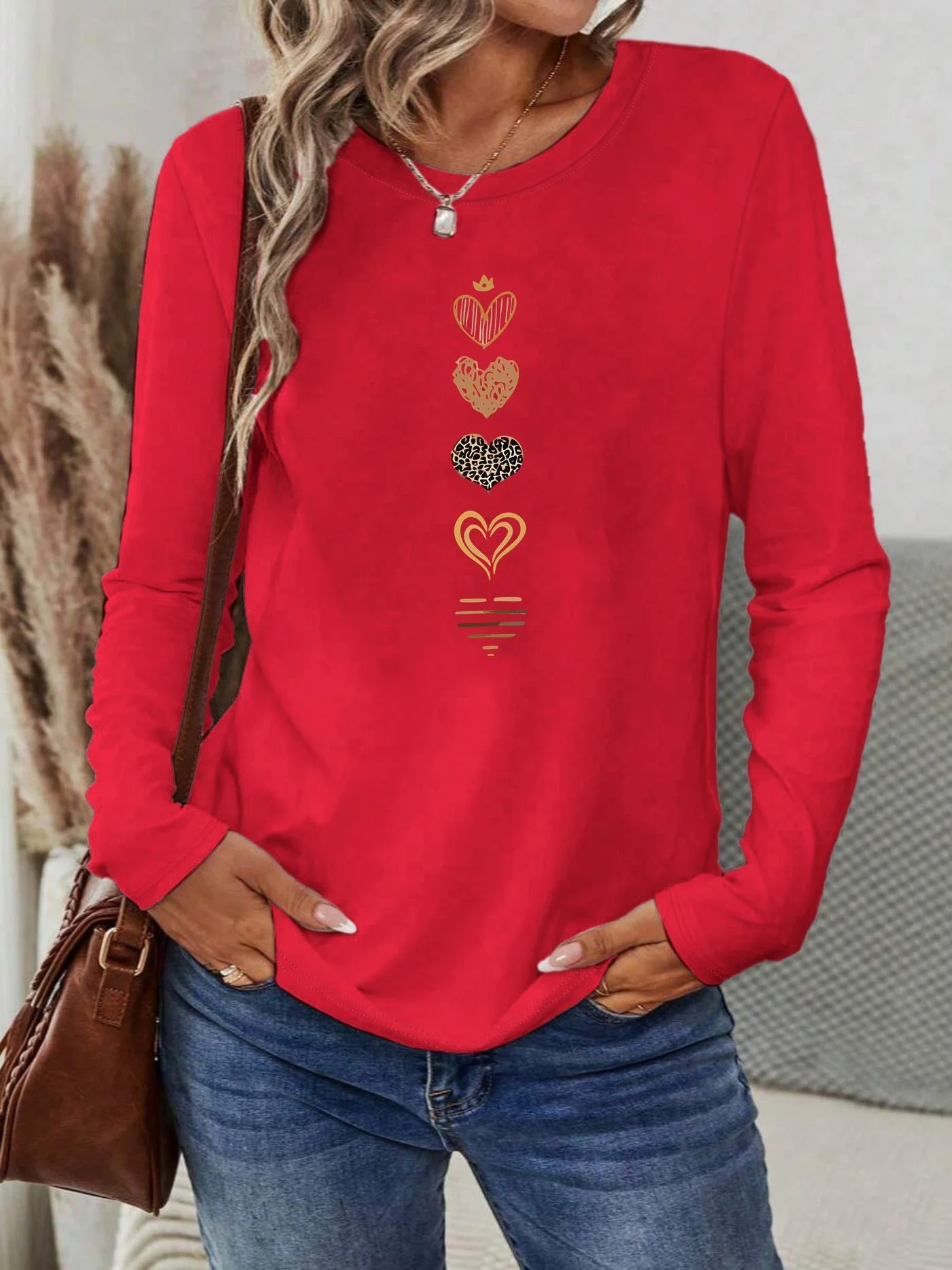 Women's Spring and Autumn 100% Cotton Fashion Casual Loose Leopard Pattern Heart Pattern Printed Round Neck Long Sleeve T-shirt