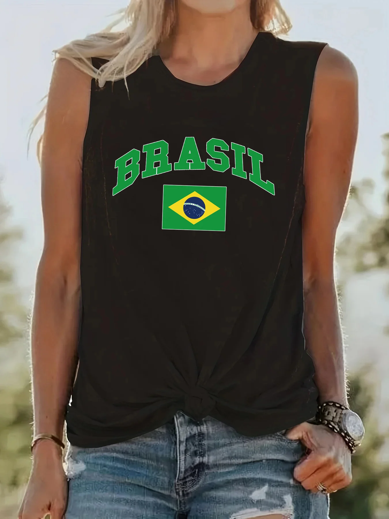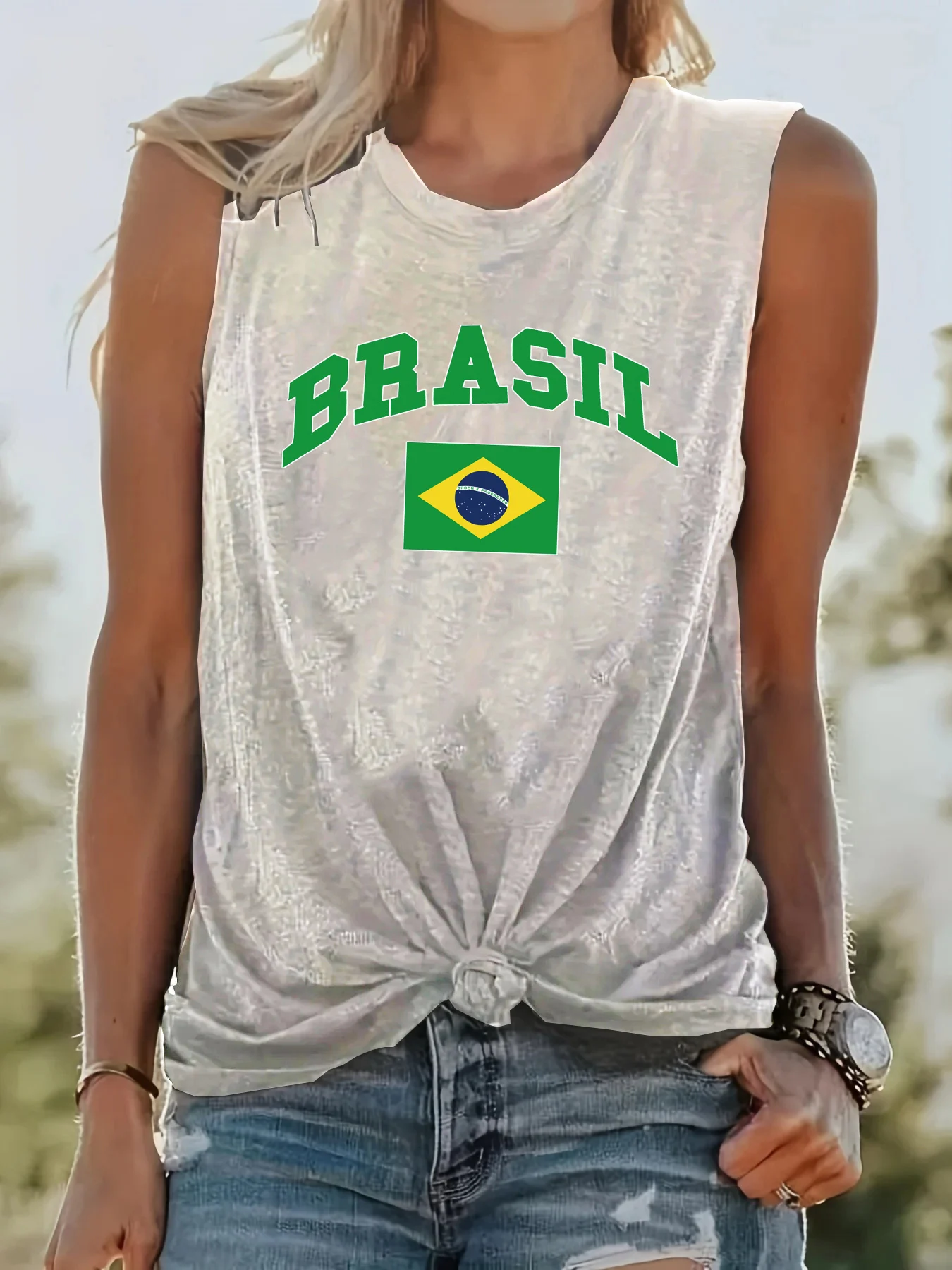 Women's Summer BRASIL Pattern Print Large Casual Round Neck Sleeveless Loose Tank Top T-shirt