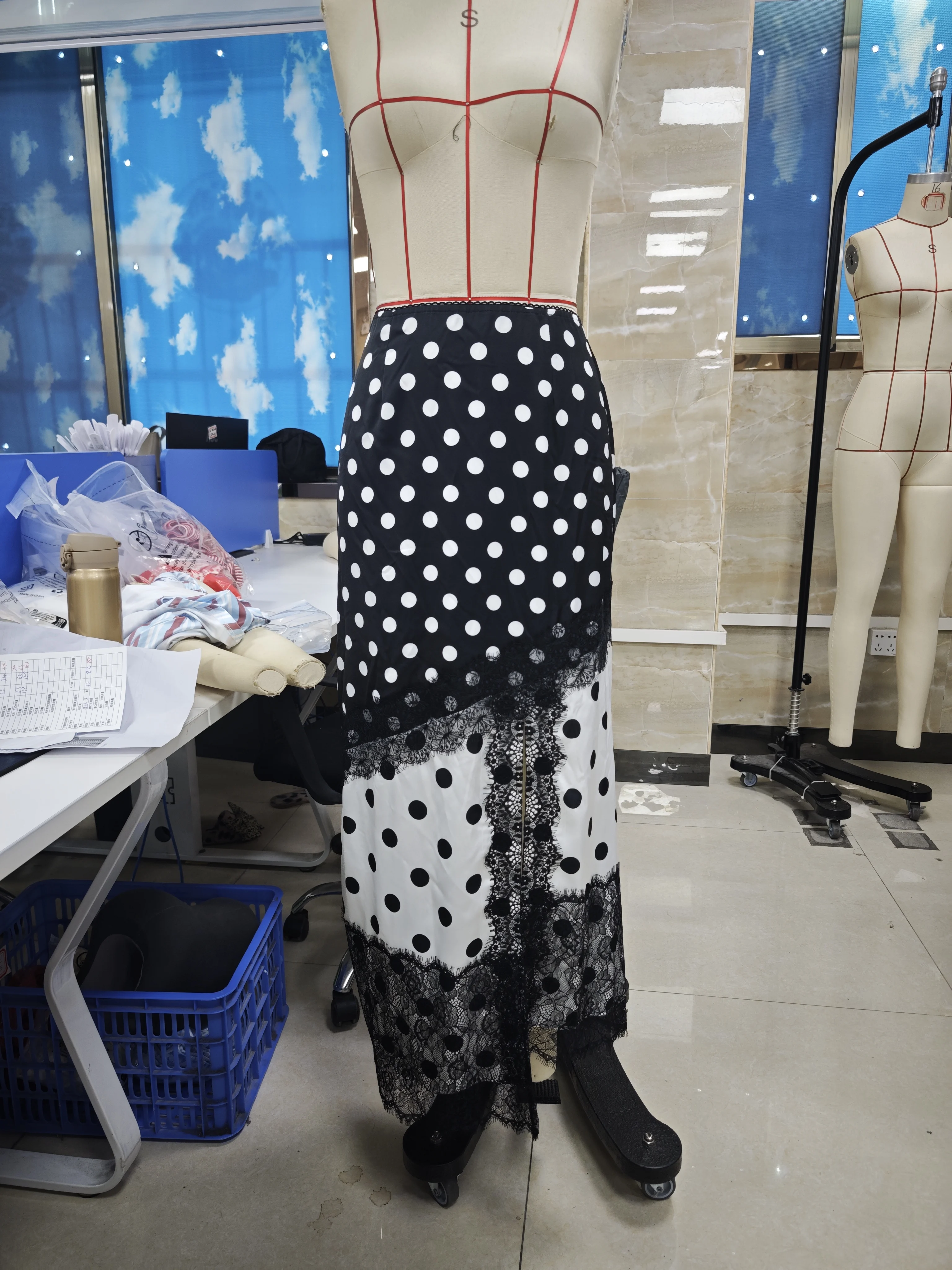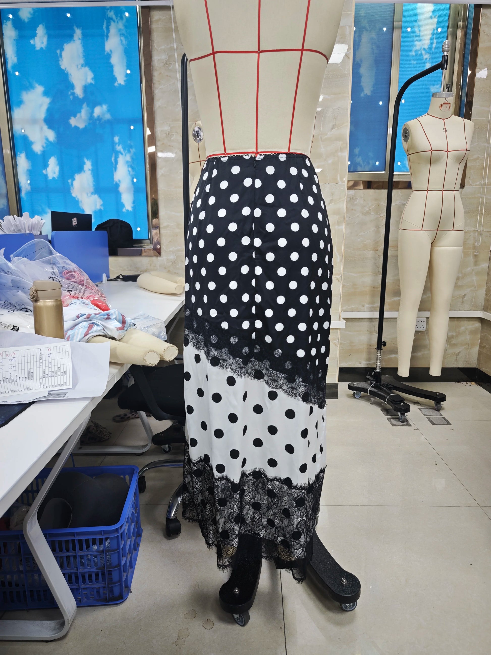 Women's Summer Elegant High Waist Long Satin Silk Skirt Dot Print Lace Trim Patchwork Contrast Color Side Split Skirt