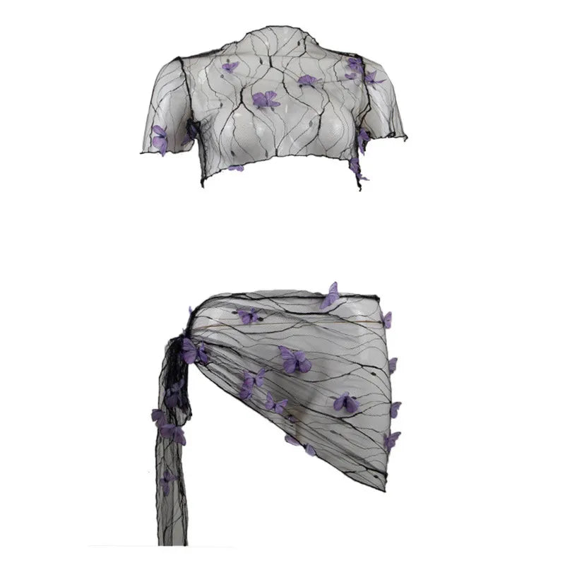 WPNAKS Women Bikini Cover-up Set Mesh Sheer Three-dimensional Butterfly Short Sleeve Crop Tops Tie-up Sarong Wrap Skirt